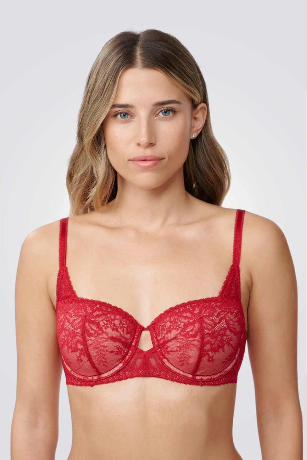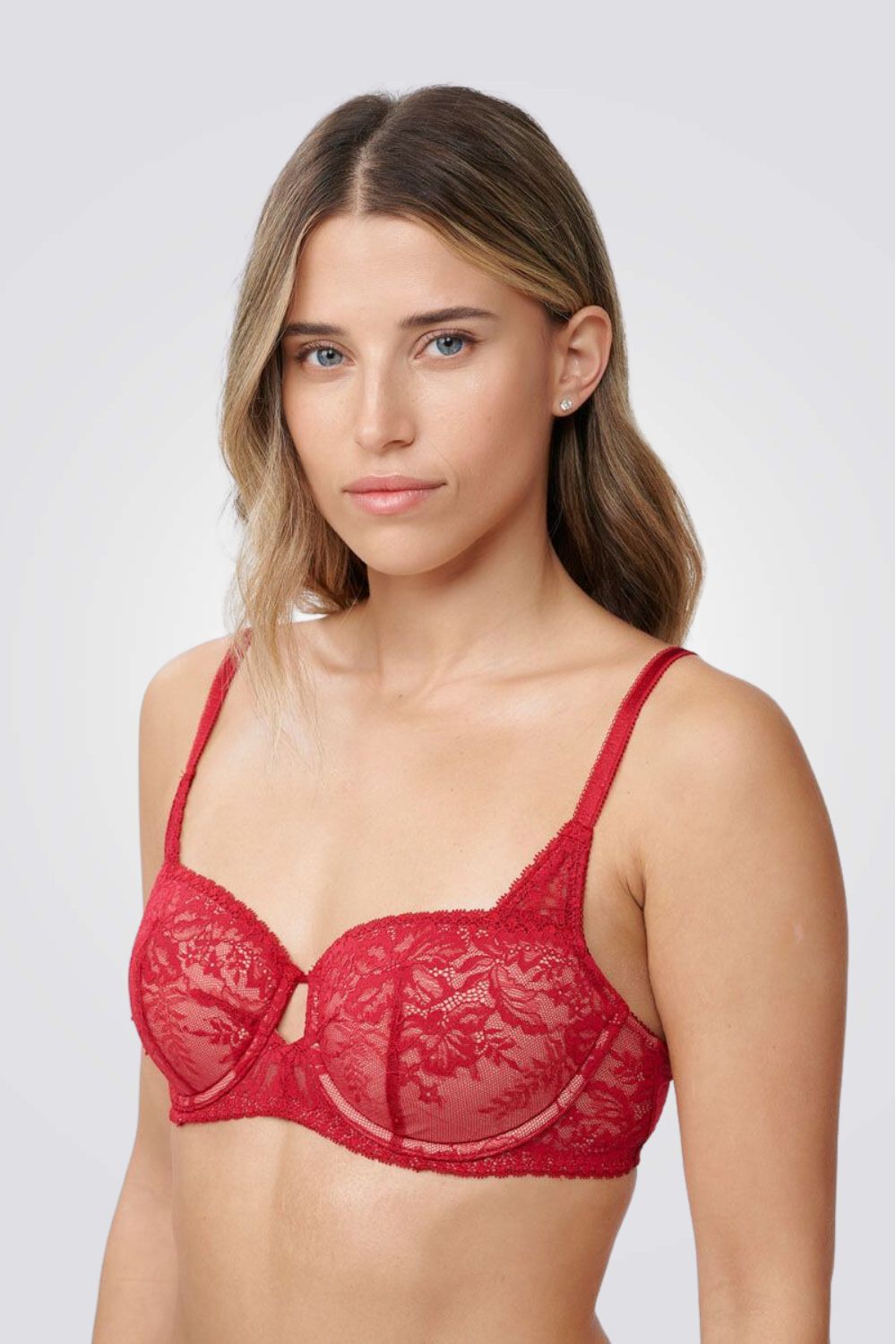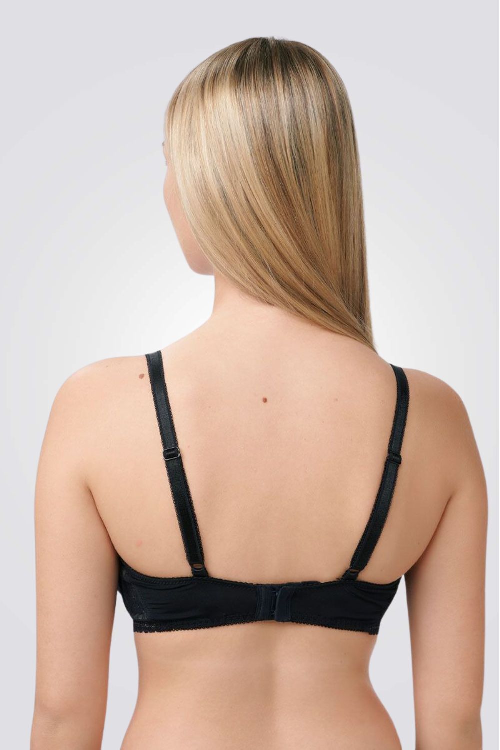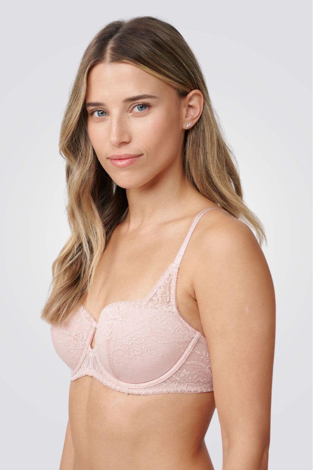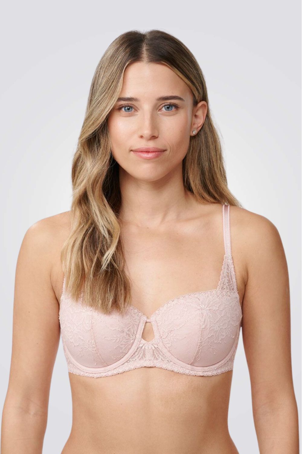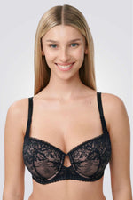 חזייה מרופדת מבית המותג FEMINA, בעלת ברזלים לתמיכה מירבית, מעוטרת בבד תחרה פרחוני, מפתח קטן באמצע החלק הקידמי, כתפיות נשלפות ומתכווננות להתאמה אישית וסגירת קרסים אחורית.