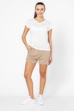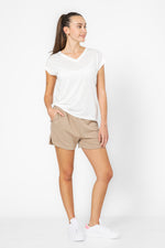 מכנסיים קצרים לנשים מבית המותג DELTA מיוצרים משילוב בד מודל קליל וגמיש עם גומי ושרוכי קשירה במותניים, שסעים קטנים בצדדים לחופש תנועה וכיסים לנוחות מירבית.