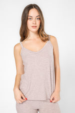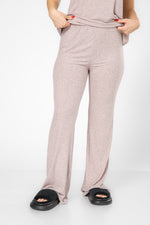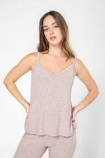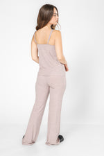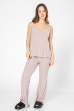 סט נוח לנשים מבית המותג DELTA המעוצבים בטקסטורת ריב נעימה. גופיה בגזרה משוחררת, מחשוף וי וכתפיות דקות ומכנסיים ארוכים בגזרה נינוחה עם גומי במותניים, שרוכי קשירה וכיסים.