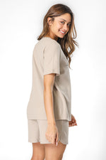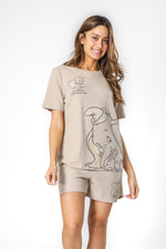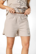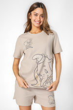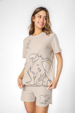 סט פיג'מת קיץ לנשים מבית המותג DELTA בטקסטורת וופל במוטיב דמבו. חולצה עם מחשוף עגול ושרוולים קצרים ומכנסיים קצרים תואמים בגזרת בוקסר עם גומי במותניים.