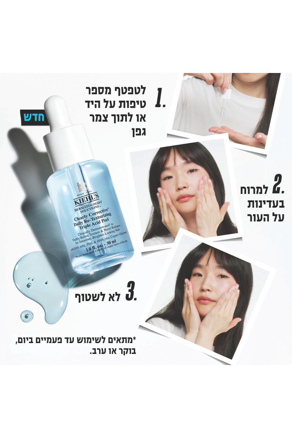 הוכח קלינית כי סרום זה מסייע לעדן את מרקם העור באופן הנראה לעין ולהעצמת הזוהר למראה עור חלק יותר ומואר יותר. הפורמולה מכילה 8.6% של קומפלקס המורכב משלוש חומצות. סרום הפילינג שלנו מסייע להחליק במהירות את מרקם העור ומעניק לו זוהר. הסרום מכיל תרכובת מתקדמת של חומצות AHA (חומצה גליקולית ולקטית), PHA (גלוקונולקטון), ו-BHA (חומצה סליצילית), הפורמולה שלנו עוזרת בהחלקת מרקם העור ובצמצום מראה הנקבוביות. הפורמולה מספיק עדינה לשימוש יומי, התמיסה המכילה גלוקונט הנחושת, תורמת לאיזון העור וצמצום סימני אי נוחות כמו יובש ואדמומיות. הסרום הינו תוספת למוצר שלנו Corrective Dark Spot Solution לצמצום מראה כתמים כהים. *תוצאות מבוססות על מחקר קליני על השכבות העליוניות של העור.