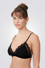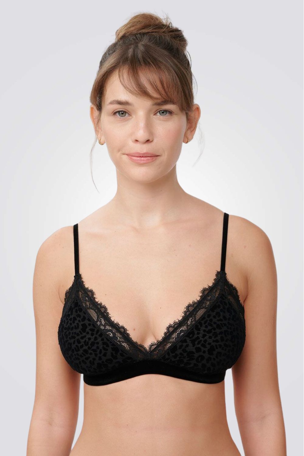 ברלט משולשים מבית המותג FEMINA העשוי בד קטיפה מנומר בשילוב תחרה פרחונית, בעל כריות נשלפות עם בטנת רשת עדינהף כתפיות דקות מתכווננות להתאמה אישית וסגירה אחורית.