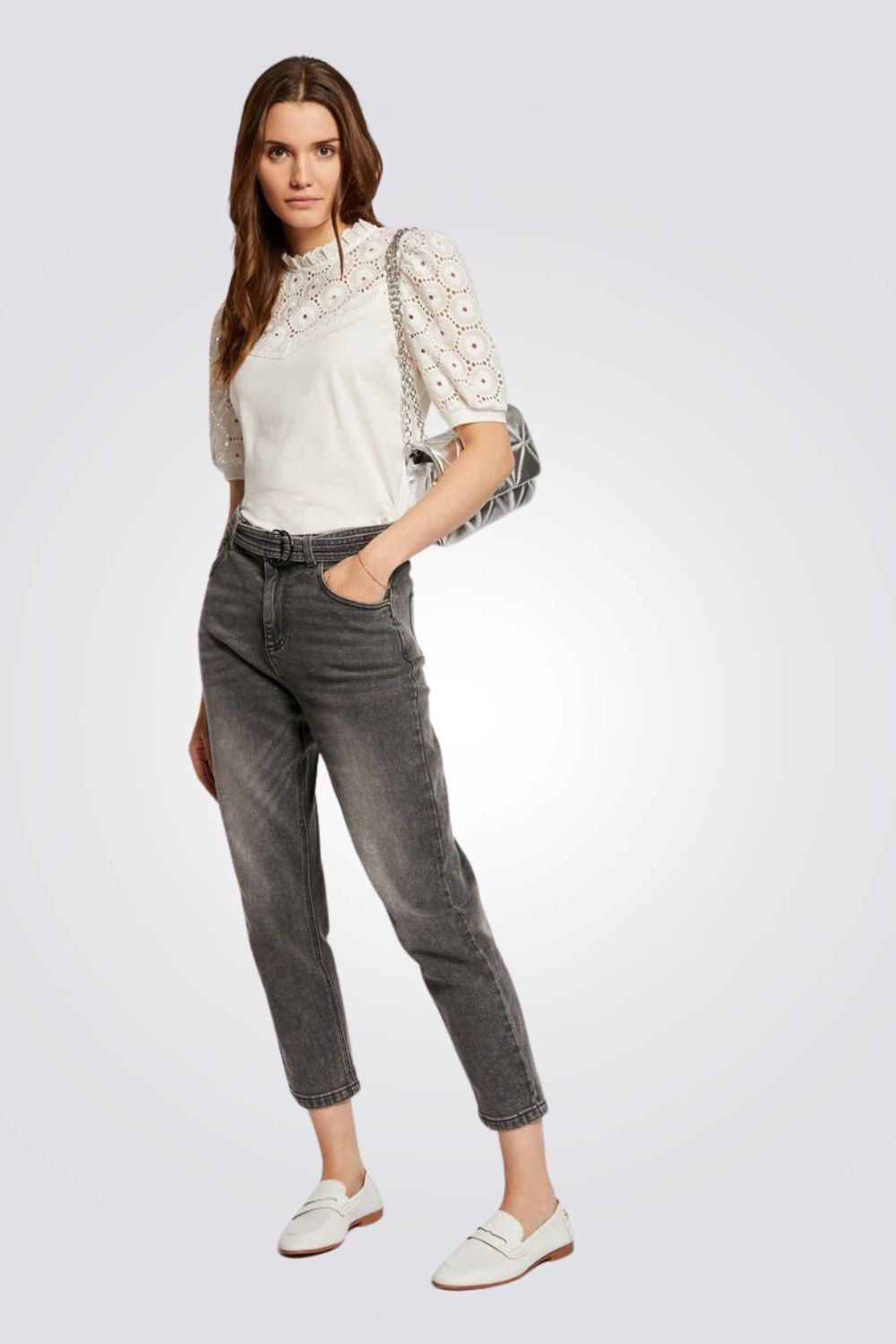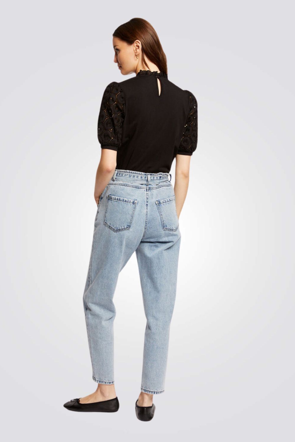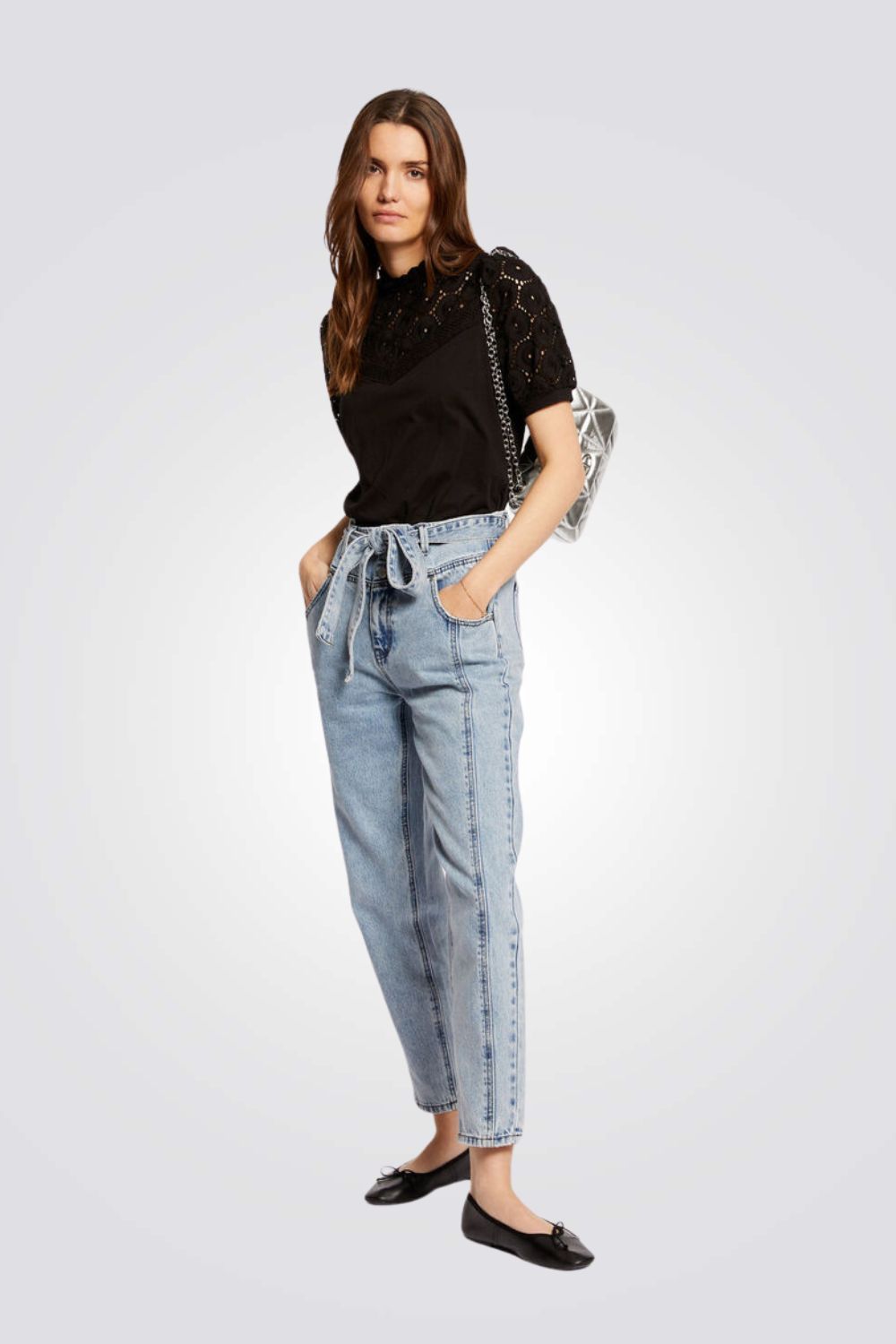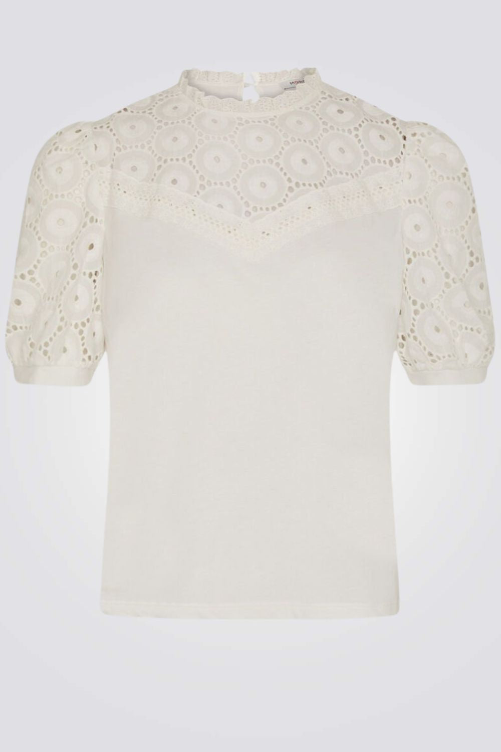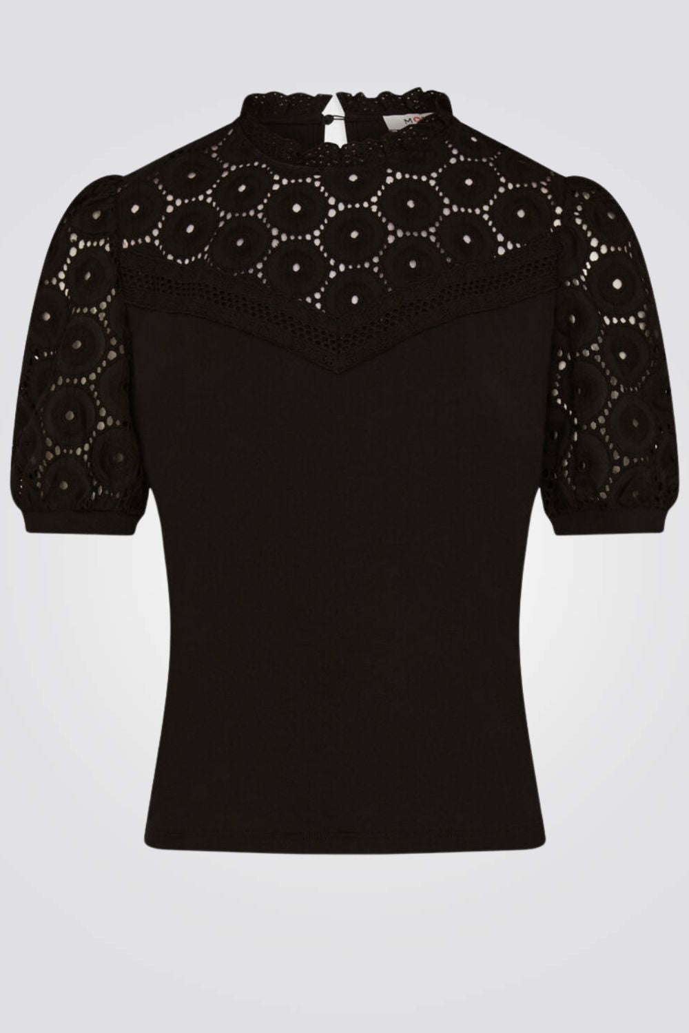 חולצה מבית המותג MORGAN, בעלת גזרה ישרה, שרוולים קצרים עם רקמה תחרה, צווארון גבוה עם הידוק כפתורים מאחורה.