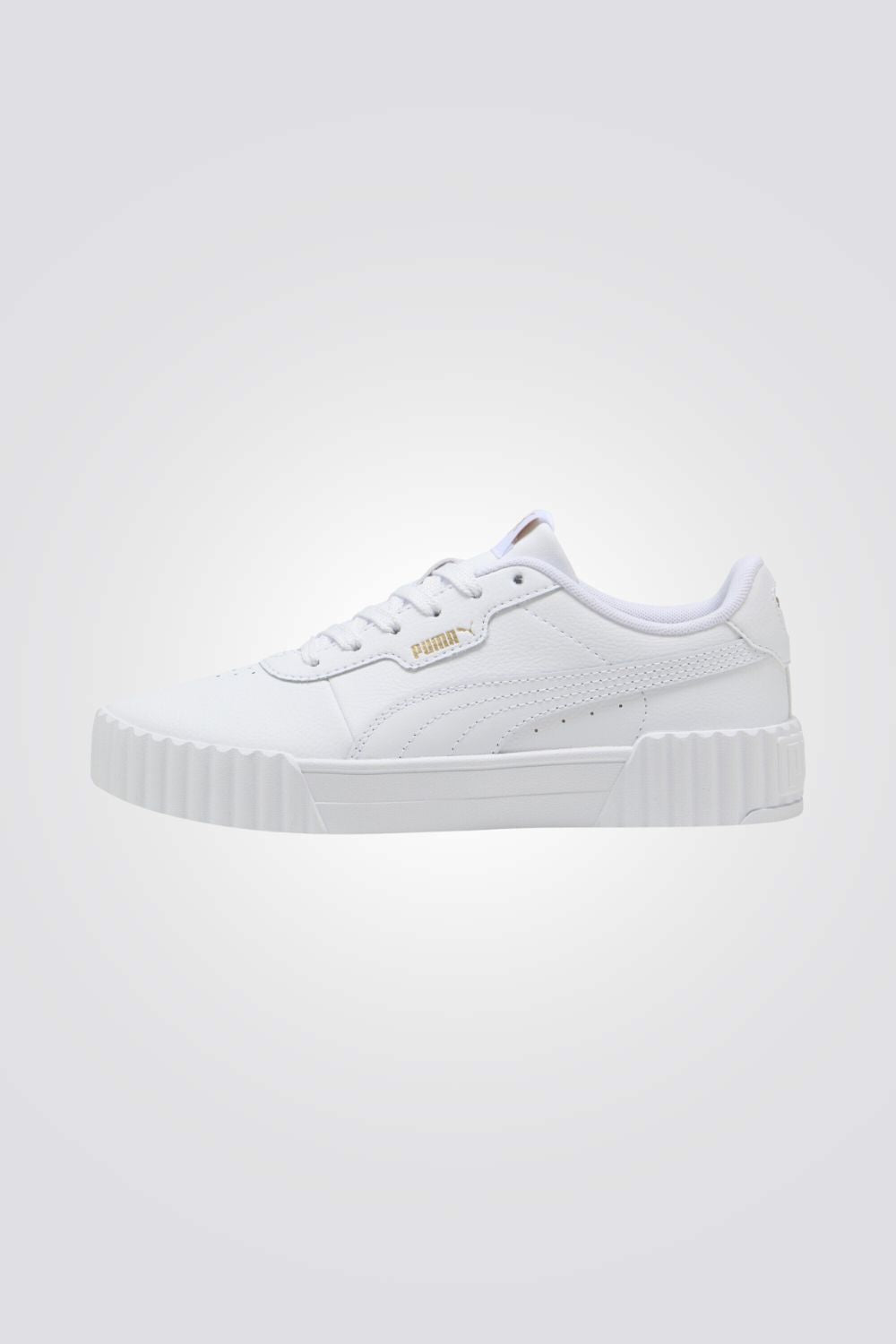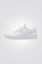 סניקרס מבית המותג PUMA לנשים בצבע לבן, בעלות חלק עליון עשוי מעור וחומר סינטטי, סוליה חיצונית מגומי בצבע לבן, שרוכים לקשירה, לוגו המותג בזהב ושלושה פסים בצבע לבן בצידי הנעל.