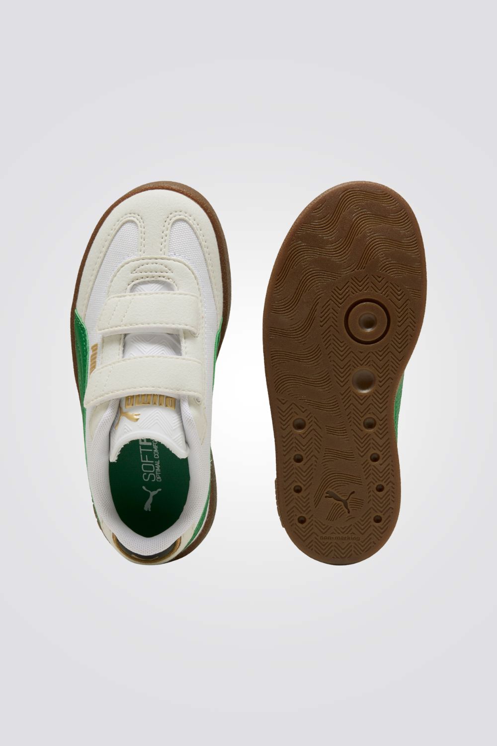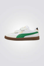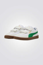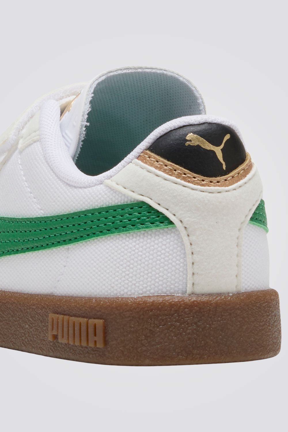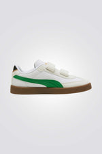 נעלי סניקרס מבית המותג PUMA לנוער בצבע לבן, בעלי סוליית גומי בצבע חום הכוללת הטבעה של שם המותג, גפת טקסטיל איכותית המעניקה מראה ייחודי ועמידות לאורך זמן, בשילוב פס צידי בצבע ירוק ולוגואים מוזהבים המוסיפים אלגנטיות ספרטיבית.