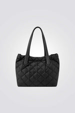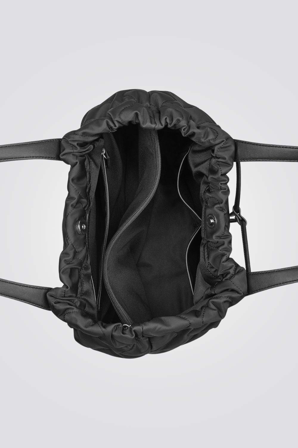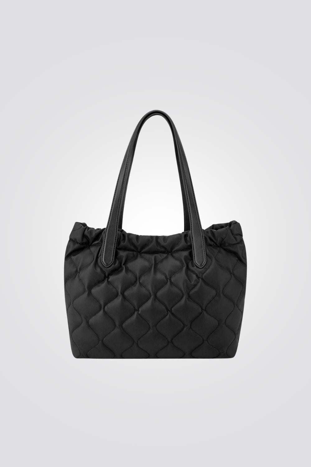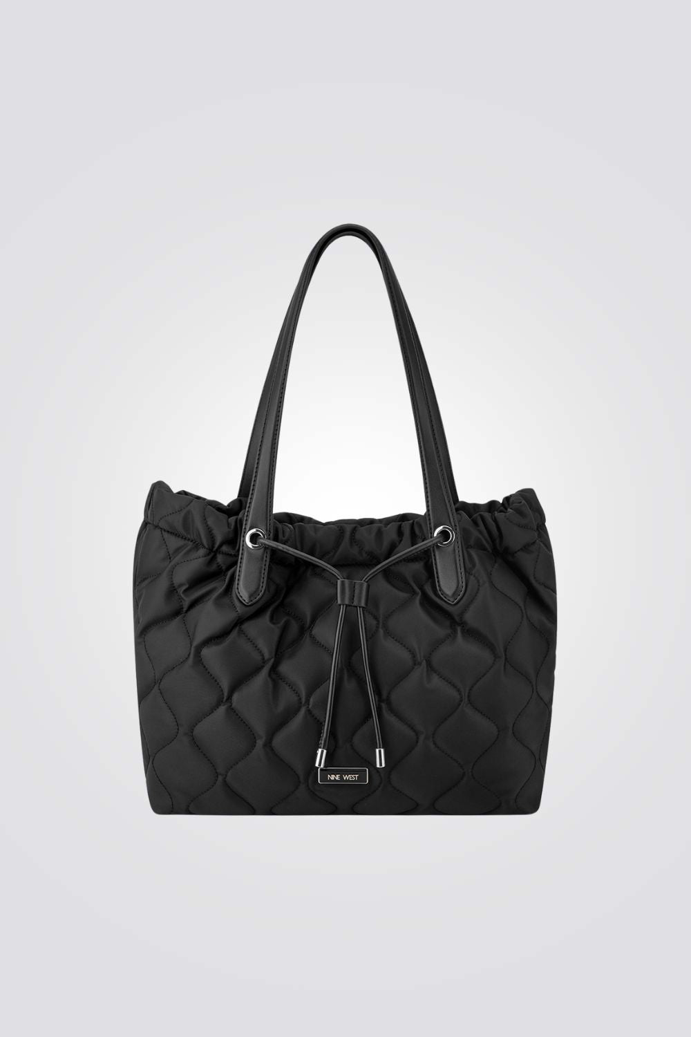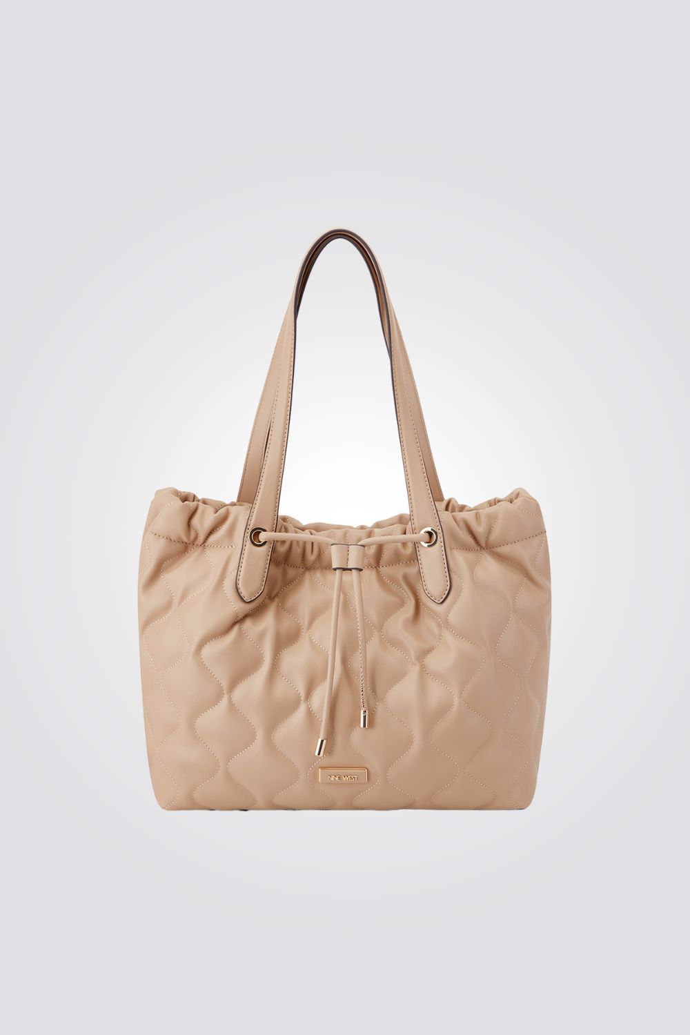 תיק יד לנשים מבית המותג NINE WEST, בעיצוב שיקי עם מקום רב לאחסון ,מחולק לשני תאים גדולים , עם סגירת כפתור ושרוך מתכווץ.