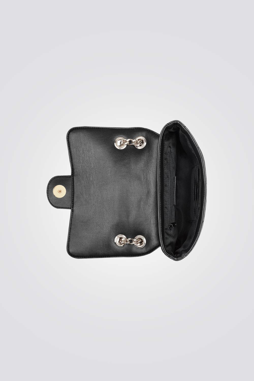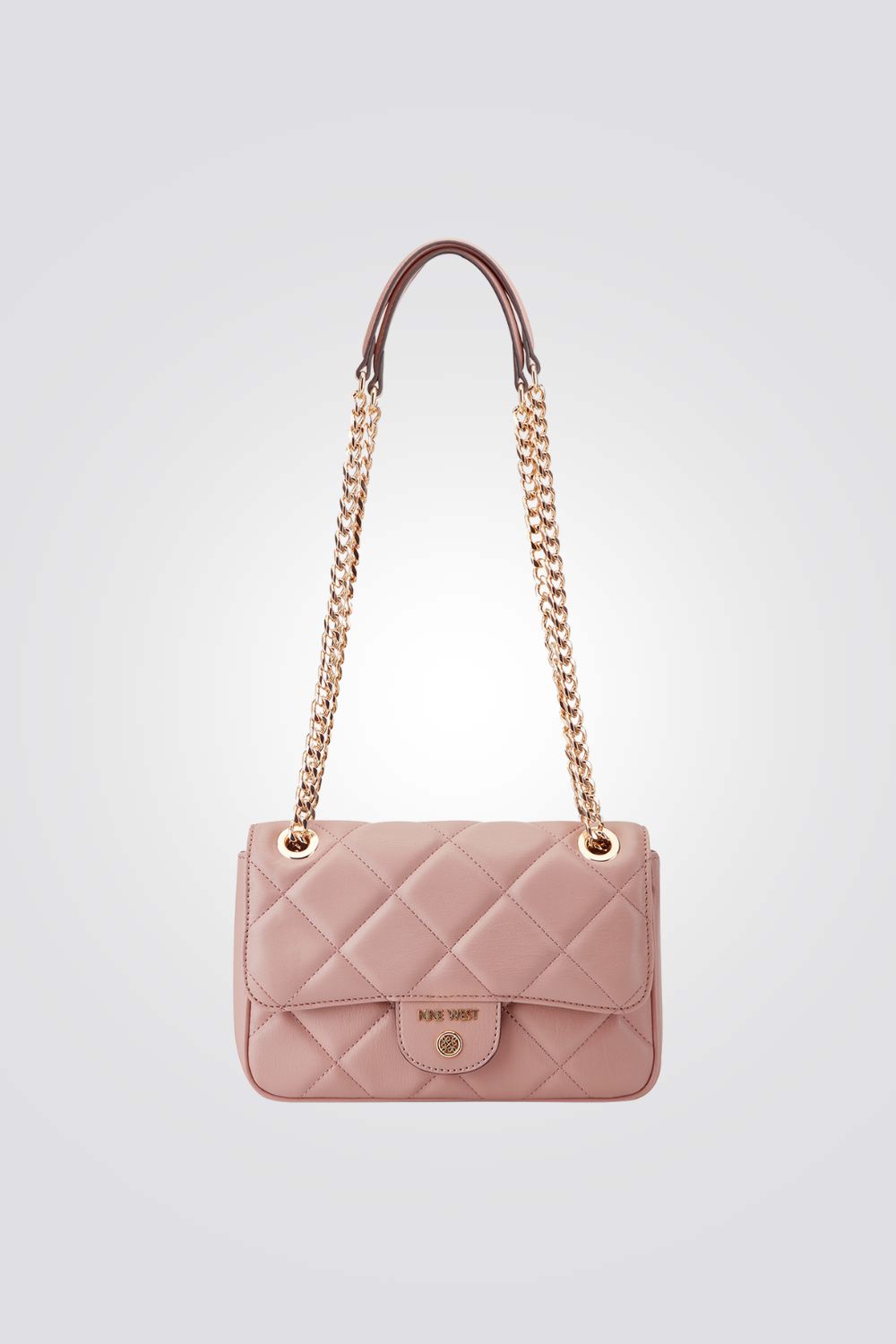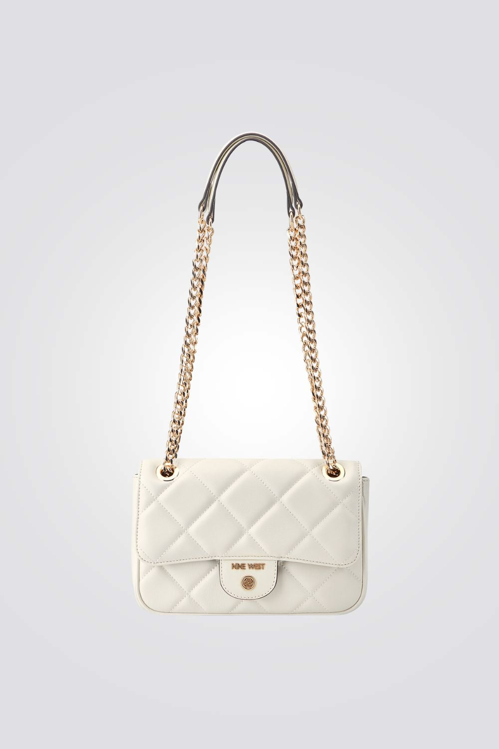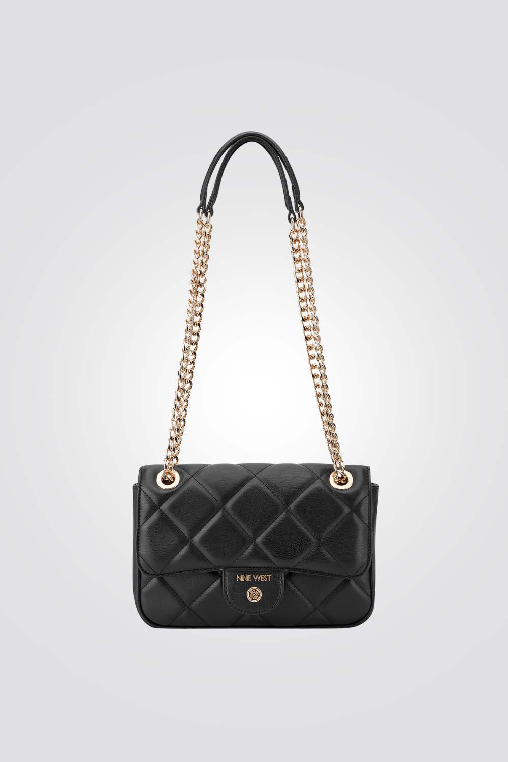 תיק צד לנשים מבית המותג NINE WEST, בעיצוב מודרני עם תא אחד וסגירה בסגנון מעטפה וכפתור ורצועות צד שרשרת זהב.