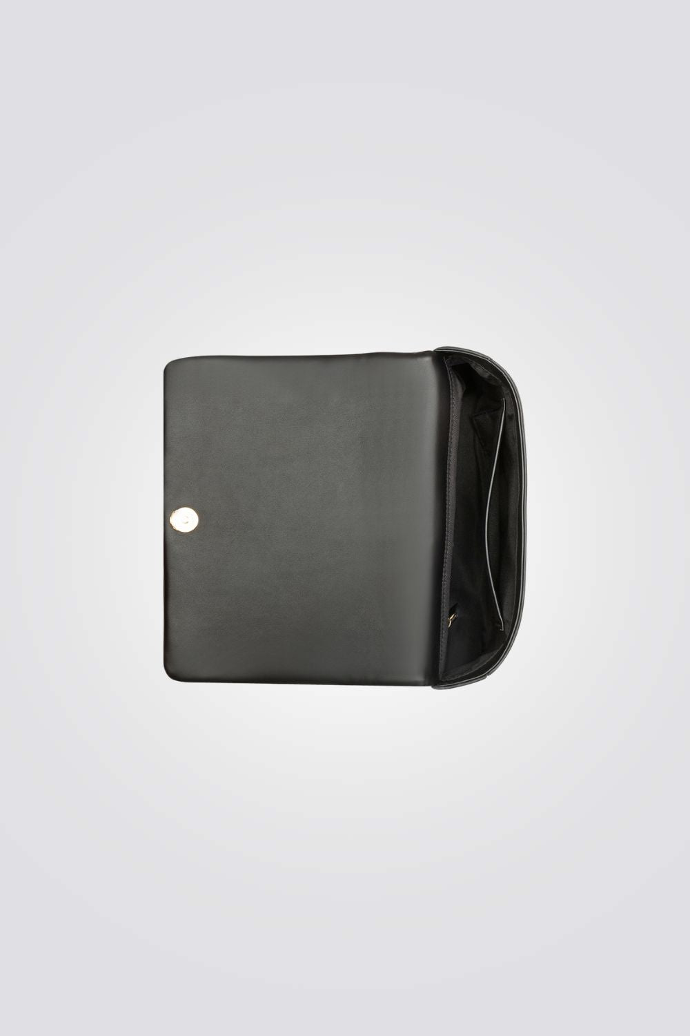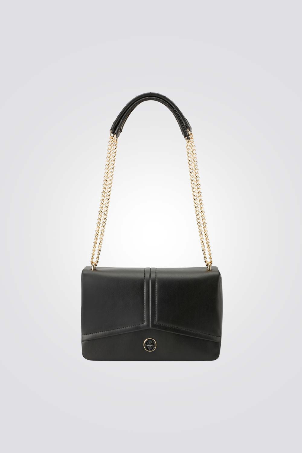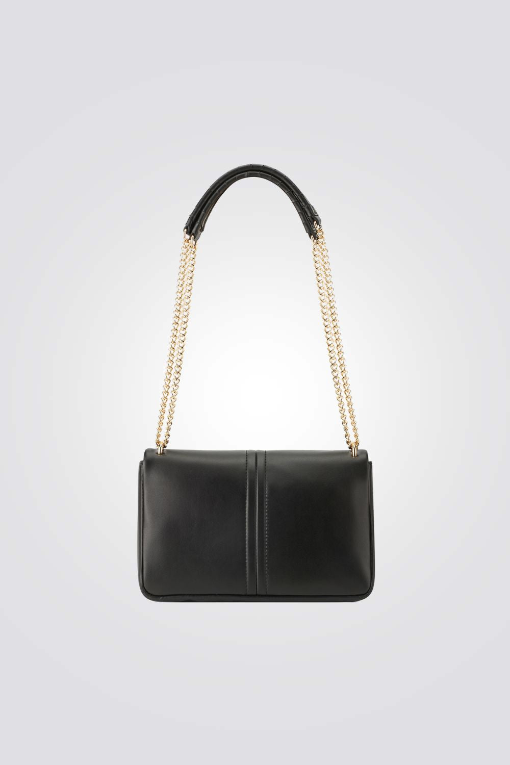 תיק יד לנשים מבית המותג NINE WEST, בצבע שחור , בעיצוב אלגנטי ונקי, תא עם סגירת רוכסן ושתי רצועות נשיאה עם עיטור שרשרת בצבע זהב.