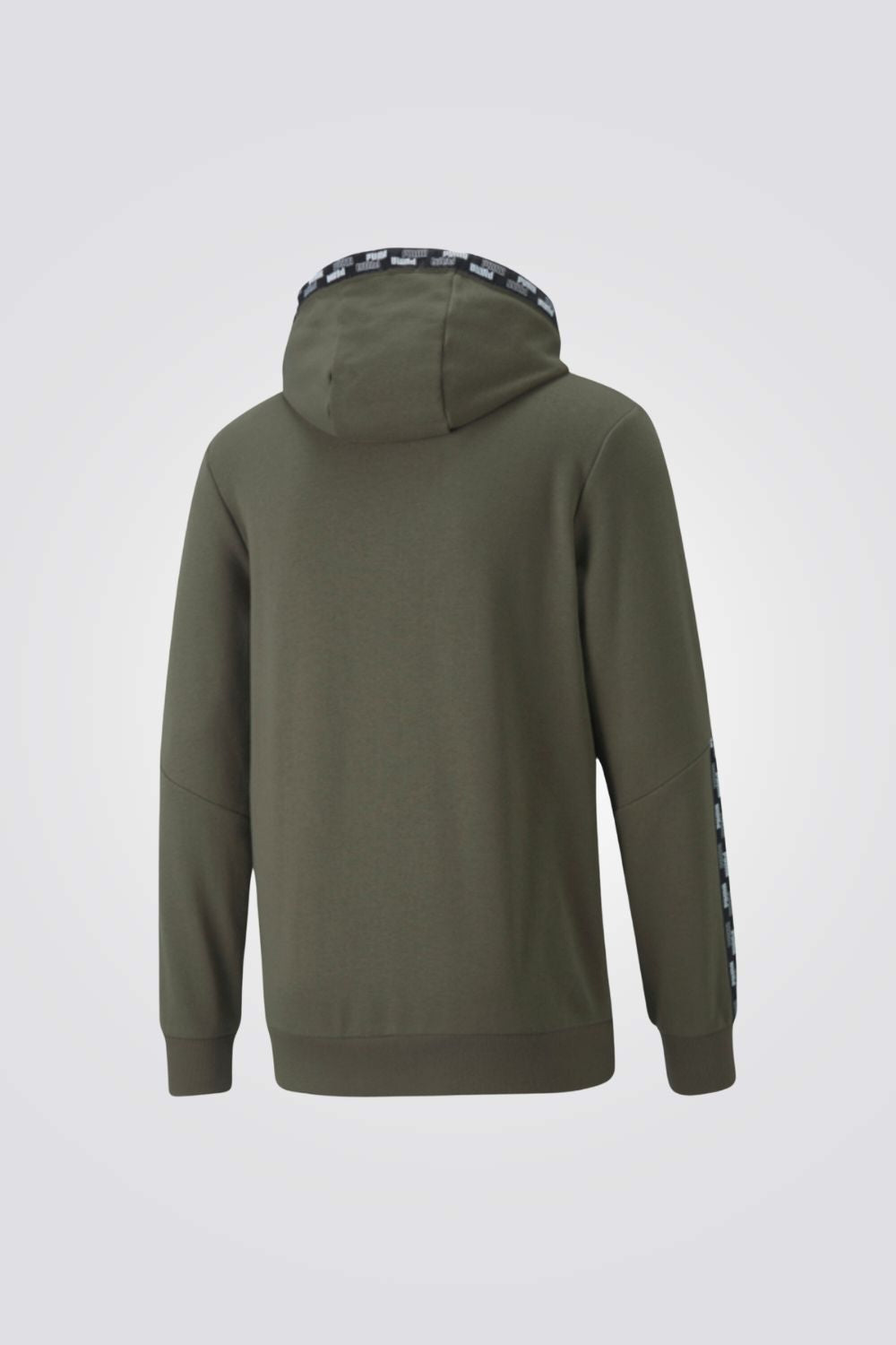 ג'קט מבית המותג PUMA לגברים בצבע ירוק זית, מבד נוח, בעל כובע ק'פוצון, ריצרץ לפתיחה וסגירה, שני כיסים קידמיים וכיתוב PUMA בשחור מקדימה.