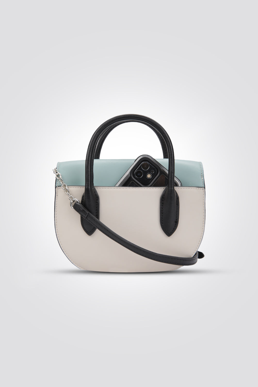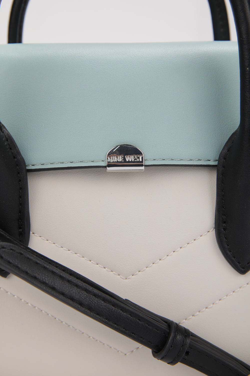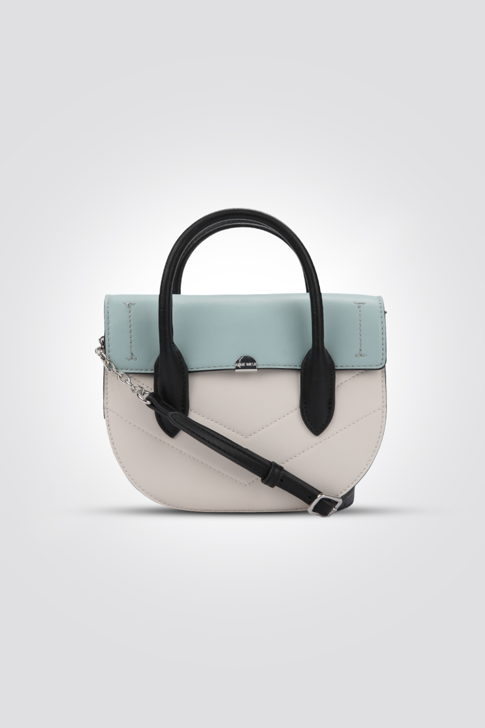 תיק צד מבית המותג NINE WEST בצבע לבן, סגירת כפתור עם מעטפת בצבע טורקיז ורצועות שחורות.