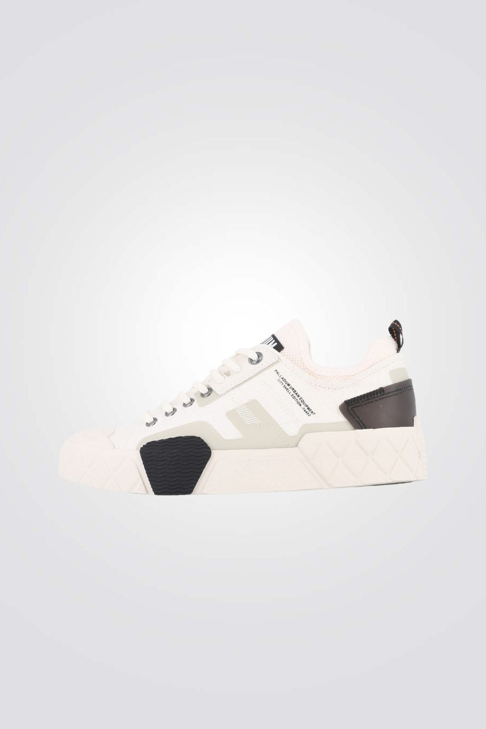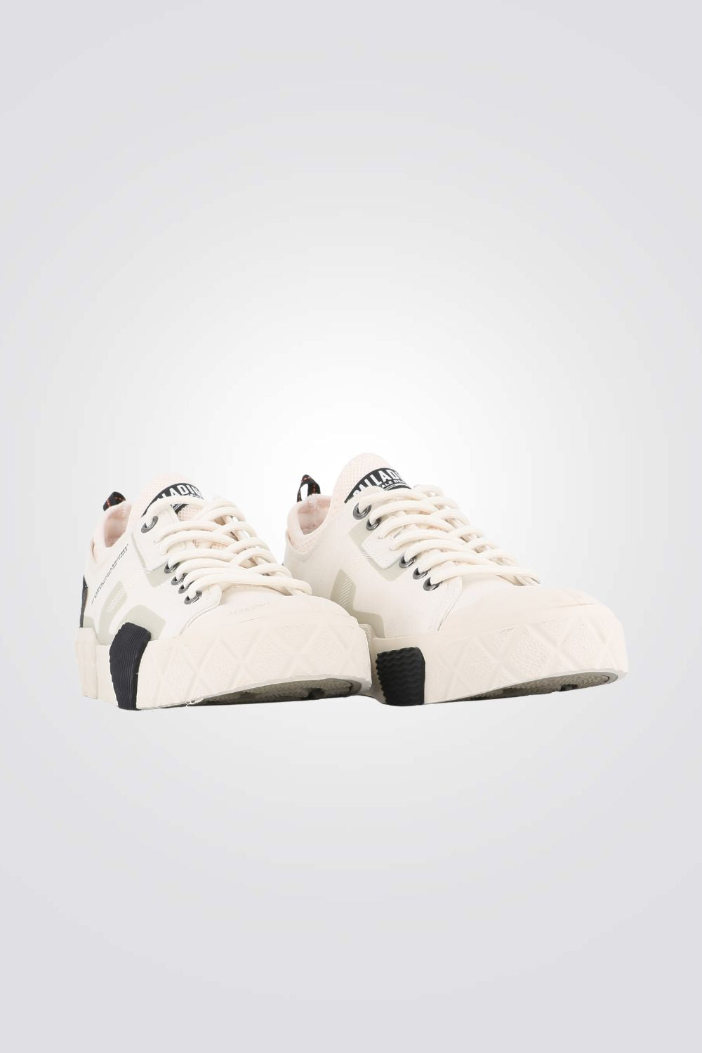 נעלי סניקרס לגברים מבית המותג PALLADIUM, קלות משקל עם גפה עשויה בד כותנה מעוטרת, שרוכי קשירה וסוליית גומי ישרה.