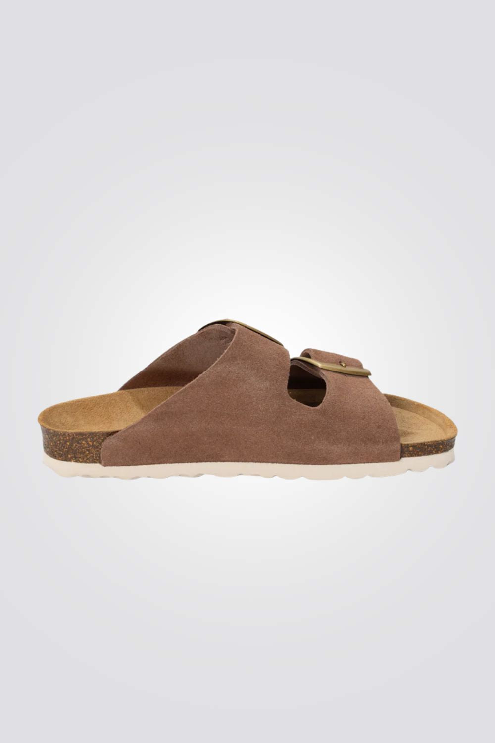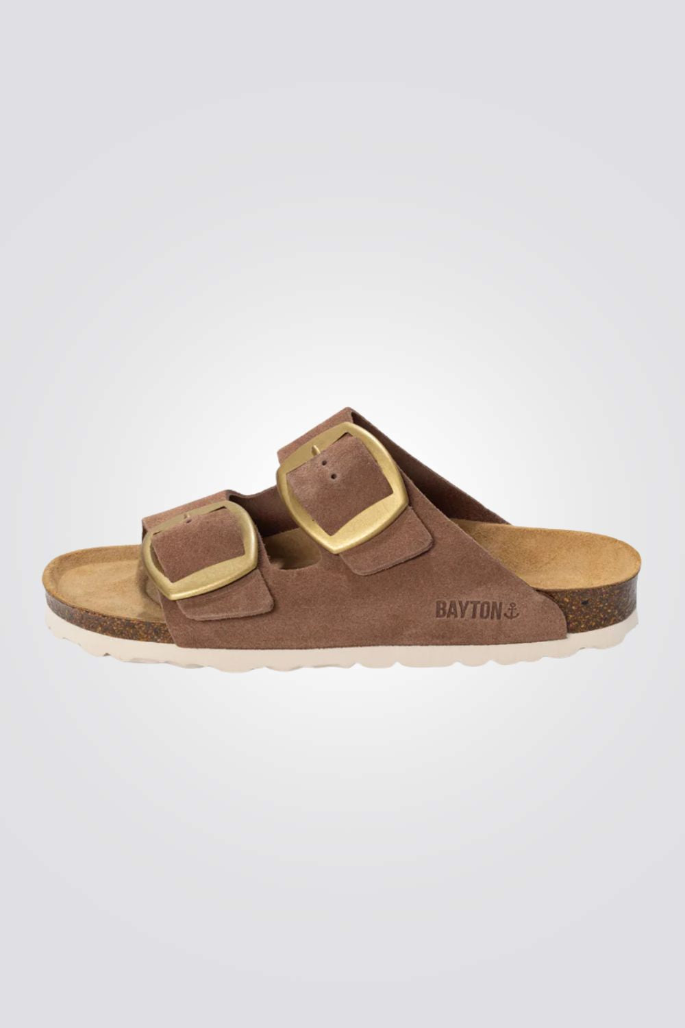 כפכפים לנשים מבית המותג BAYTON, עשויים בד עור הפוך (זמש) בצבע בז' כהה, בעלי 2 רצועות עם אבזם וסוליית שעם.