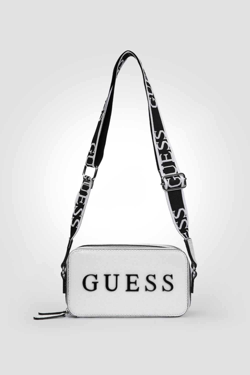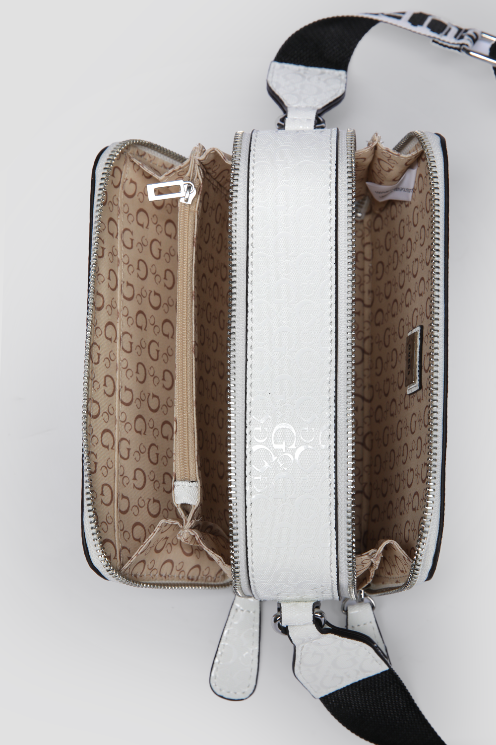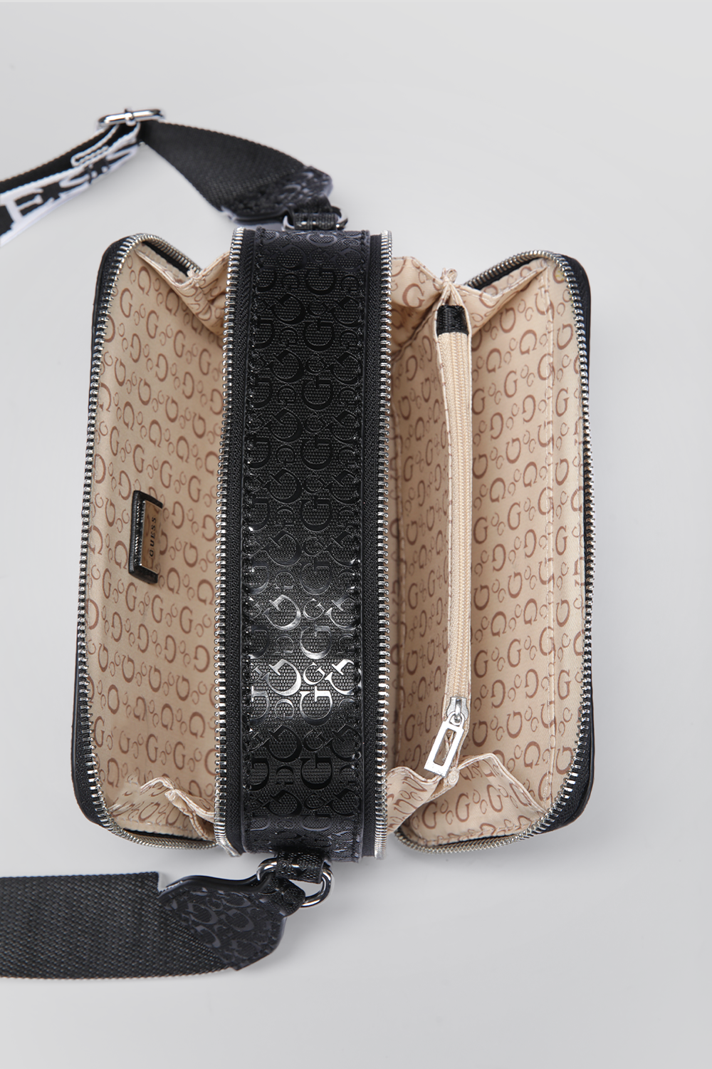 תיק צד קטן לנשים מבית המותג GUESS, מבד דמוי עור, בעל רצועת כתף רחבה מתכווננת, 2 תאים מרכזיים עם סגירת רוכסן, כיסים פנימיים ולוגו מוטבע בחזית.