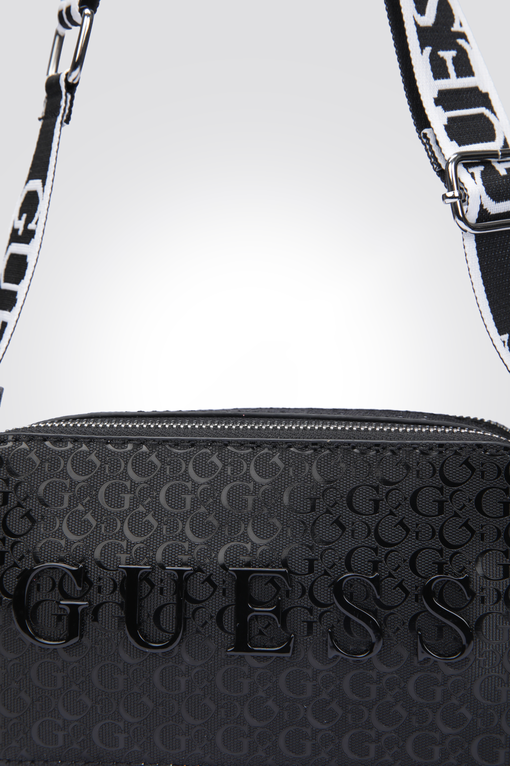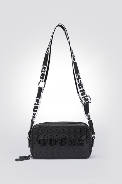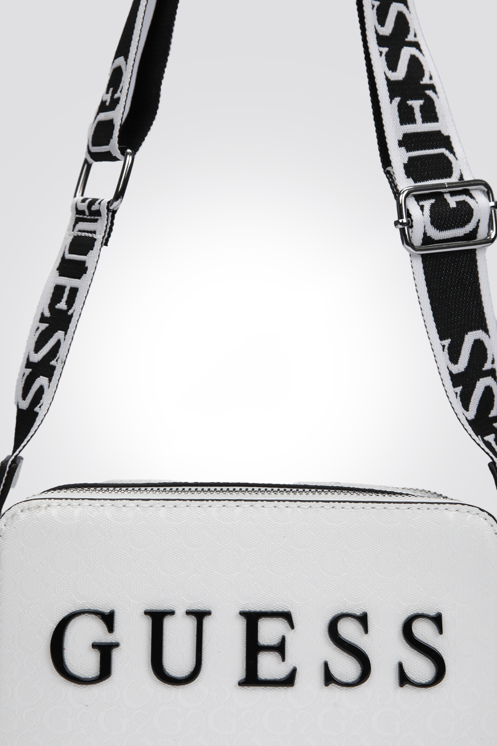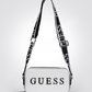 תיק צד קטן לנשים מבית המותג GUESS, מבד דמוי עור, בעל רצועת כתף רחבה מתכווננת, 2 תאים מרכזיים עם סגירת רוכסן, כיסים פנימיים ולוגו מוטבע בחזית.