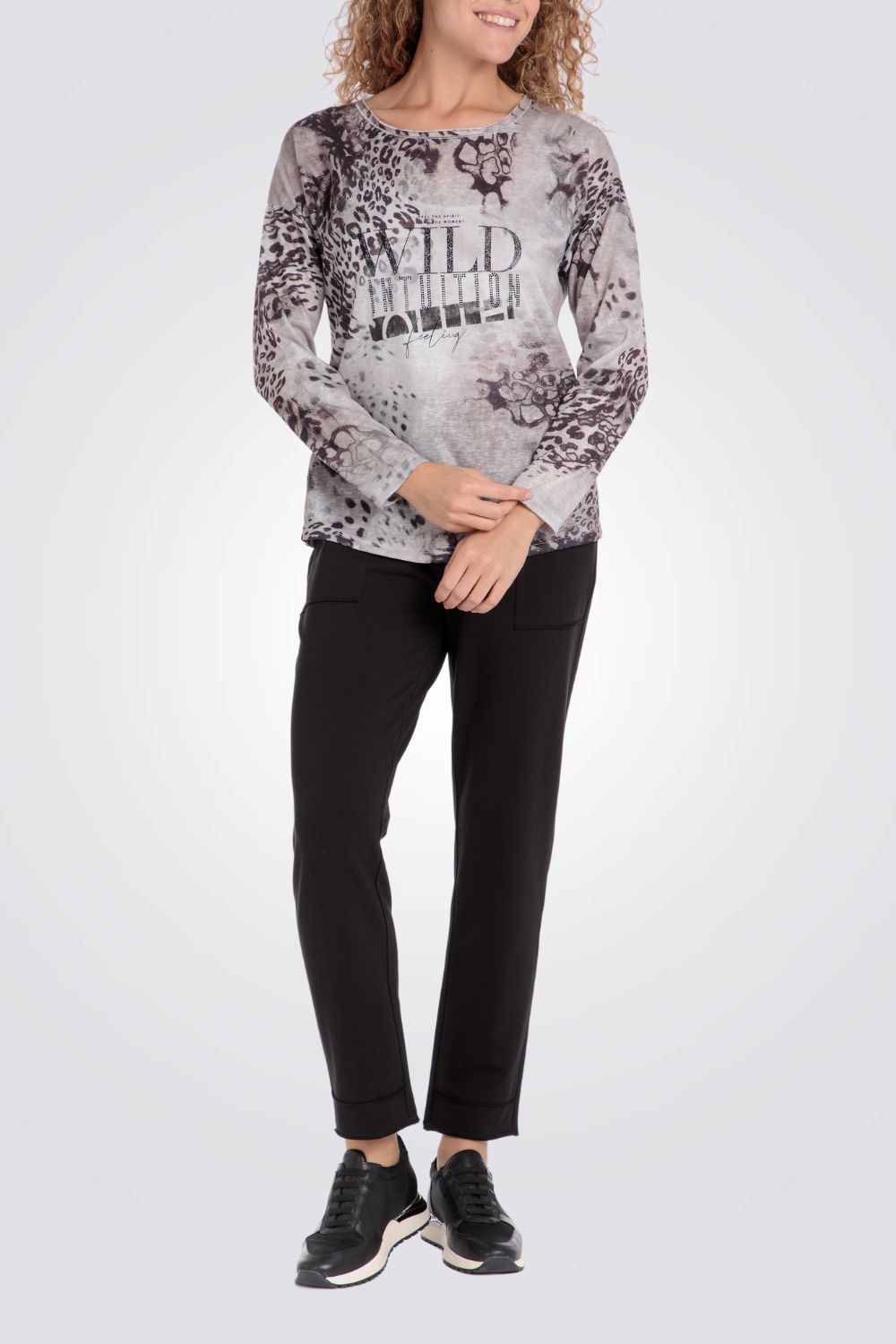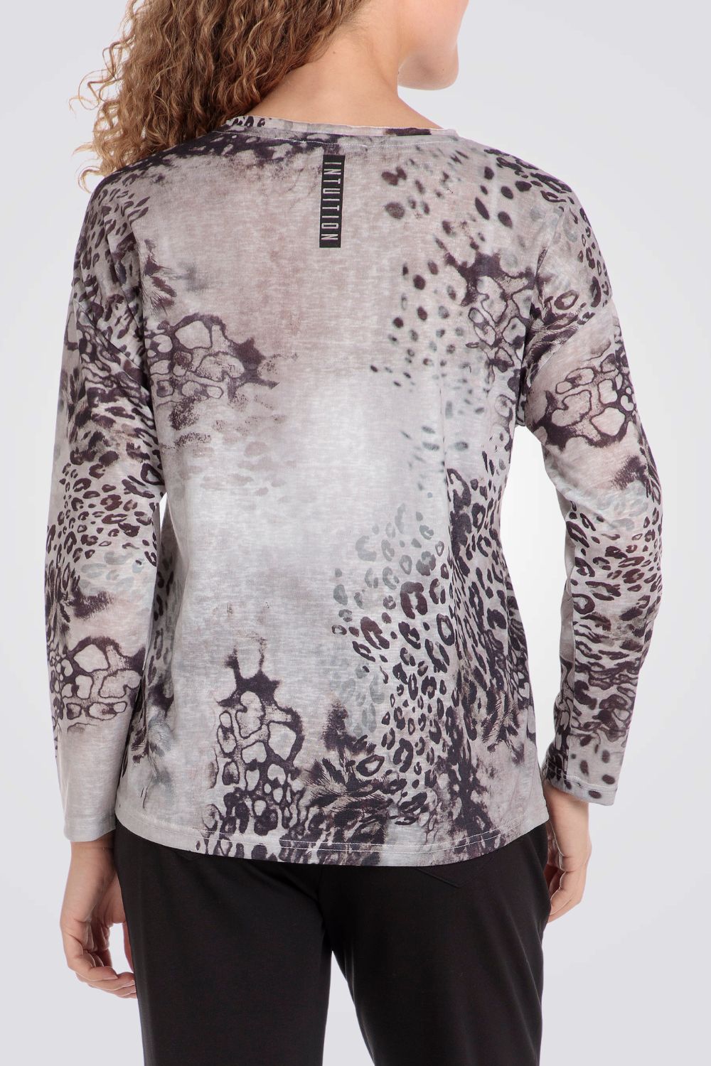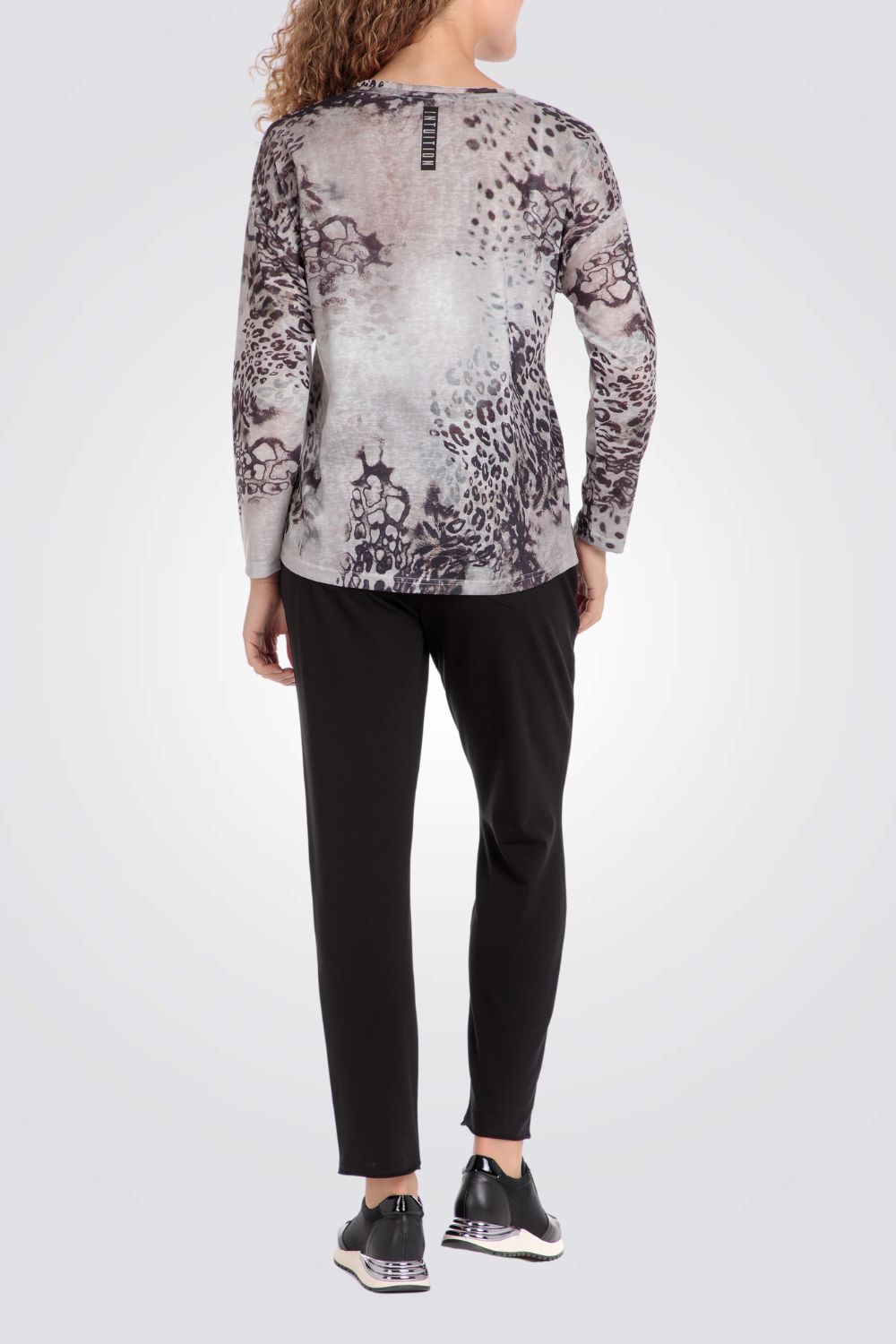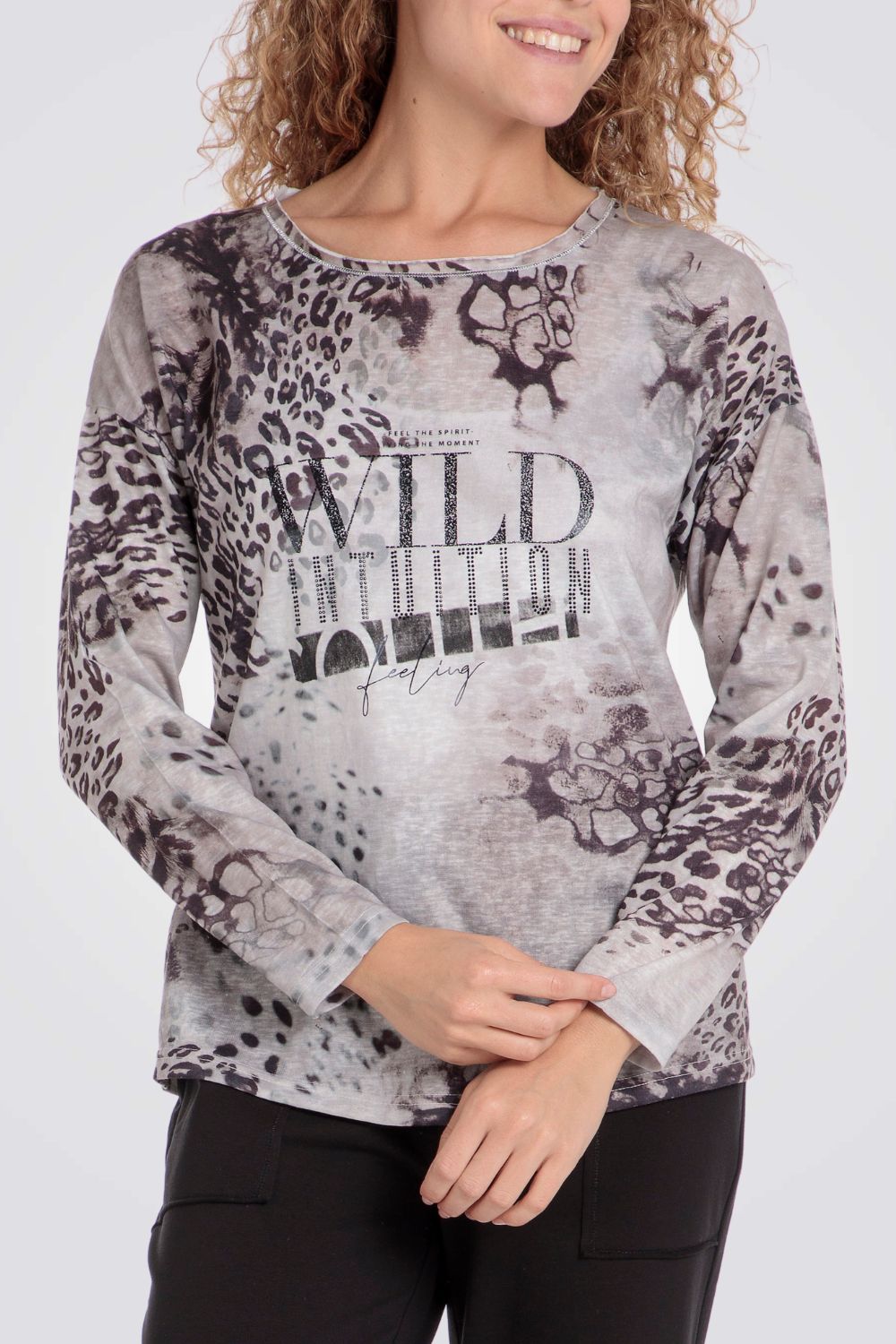 חולצת טי לנשים מבית המותג PUNT ROMA בצבע בז'-אפור עם הדפס מנומר, בעל שרוולים ארוכים וצווארון עגול.