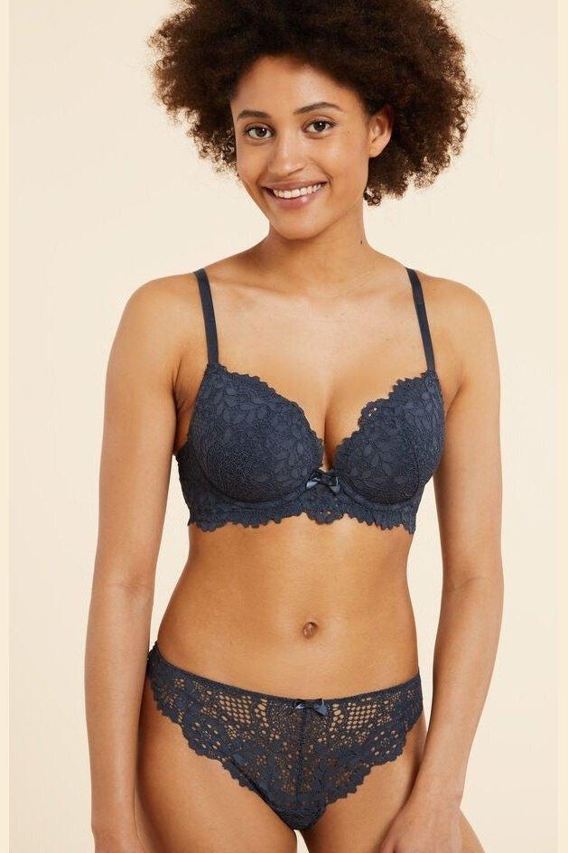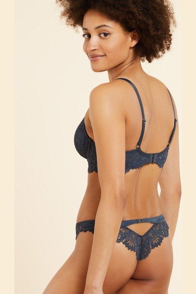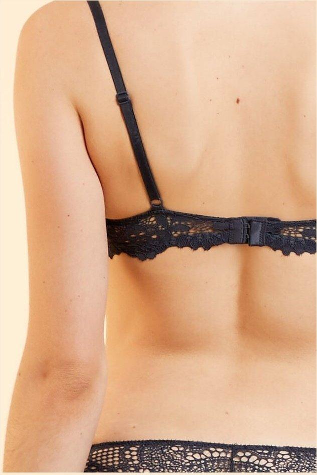 חזייה מבית המותג ETAM עשוייה תחרה עדינה בדוגמה פרחונית, עם קאפים בריפוד קל המעניקים מראה מעוצב וטבעי, כתפיות דקות מתכווננות וסגירת קרסים אחורית.