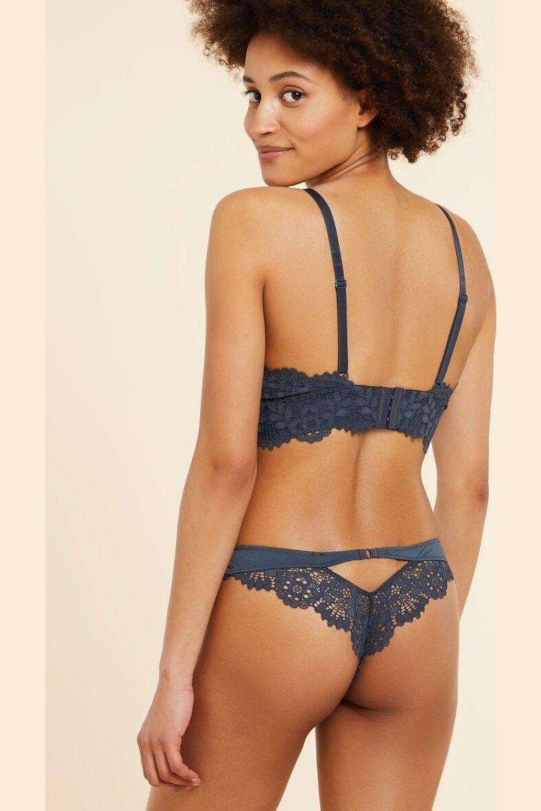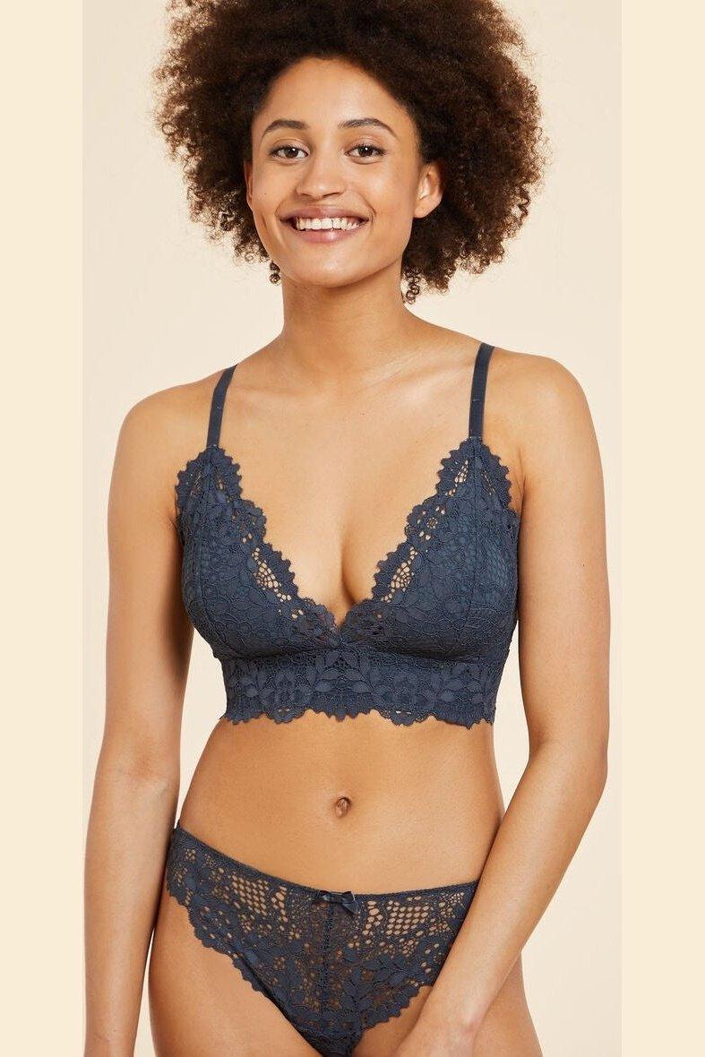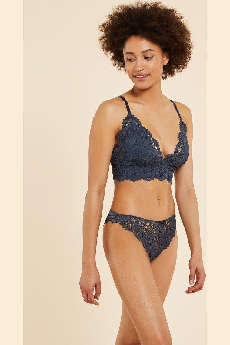 חזיית תחרה בדוגמה פרחונית מבית המותג ETAM קאפים בעיצוב משולשים במחשוף עמוק, בריפוד קל וללא ברזל, עם רצועה רחבה תומכת מתחת לחזה, כתפיות מתכווננות וסגירת קרסים אחורית.
