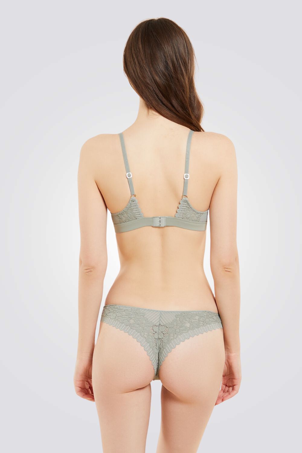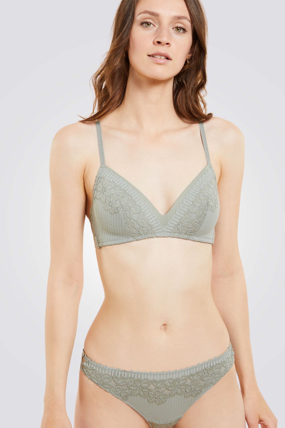 חזייה מבית המותג ETAM, קאפים בעיצוב משולשים בריפוד קל ללא ברזל, עם תחרה בדוגמת פסים ופרחים, כתפיות דקות מתכווננות וסגירת קרסים אחורית.