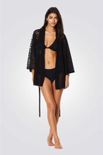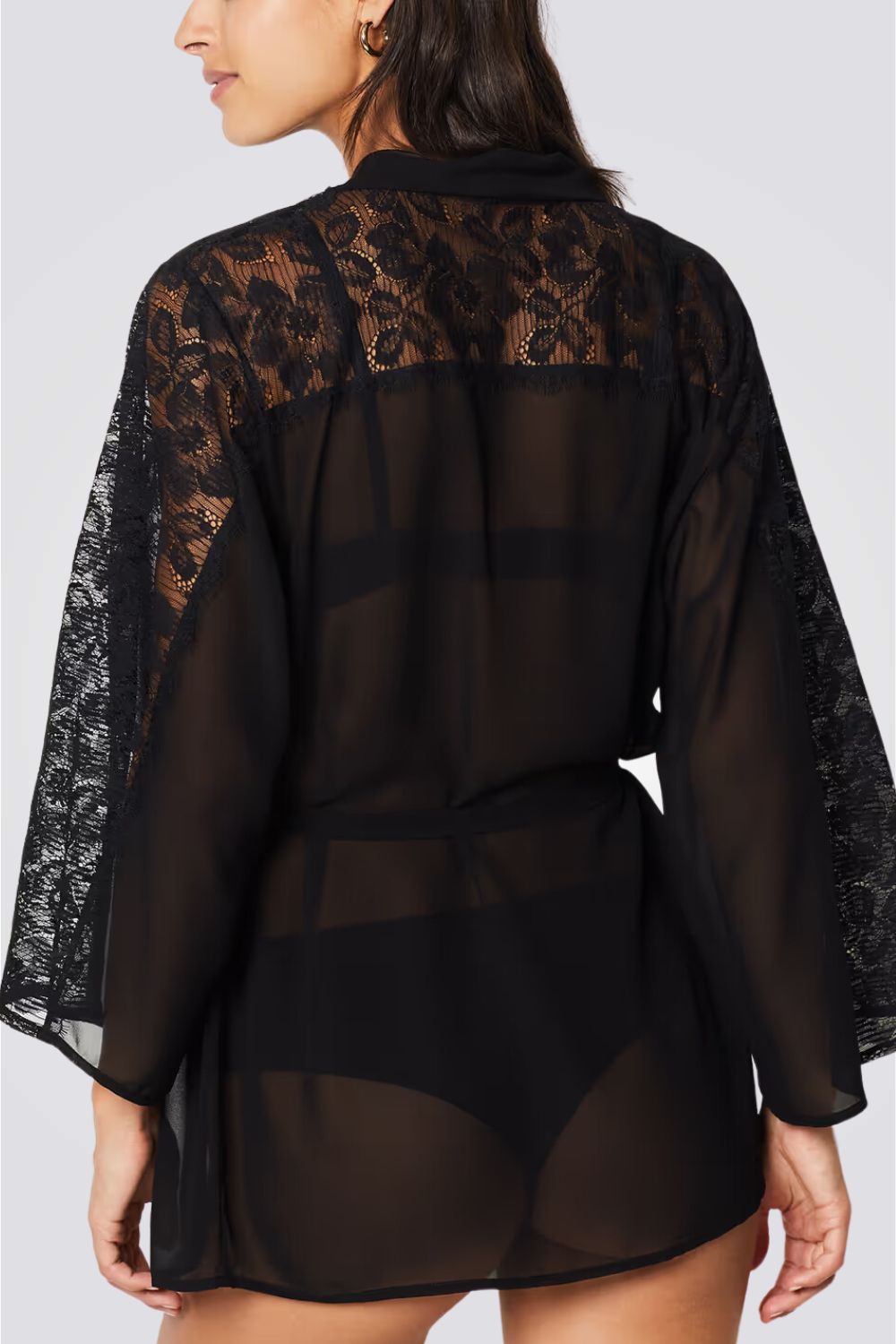חלוק לילה מבית המותג הצרפתי ETAM מורכב מבד סאטן שחור ועדין עם שרוולים ועיטורי גב מתחרה פרחונית.