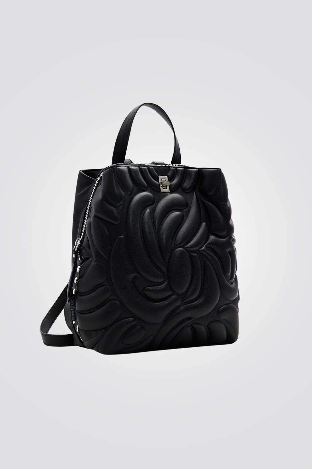 תיק גב לנשים מבית המותג DESIGUAL, בצבע שחור, בעיצוב מודרני, תא ראשי עם סגירת רוכסן , שתי רצועות גב ורצועת יד קטנה.