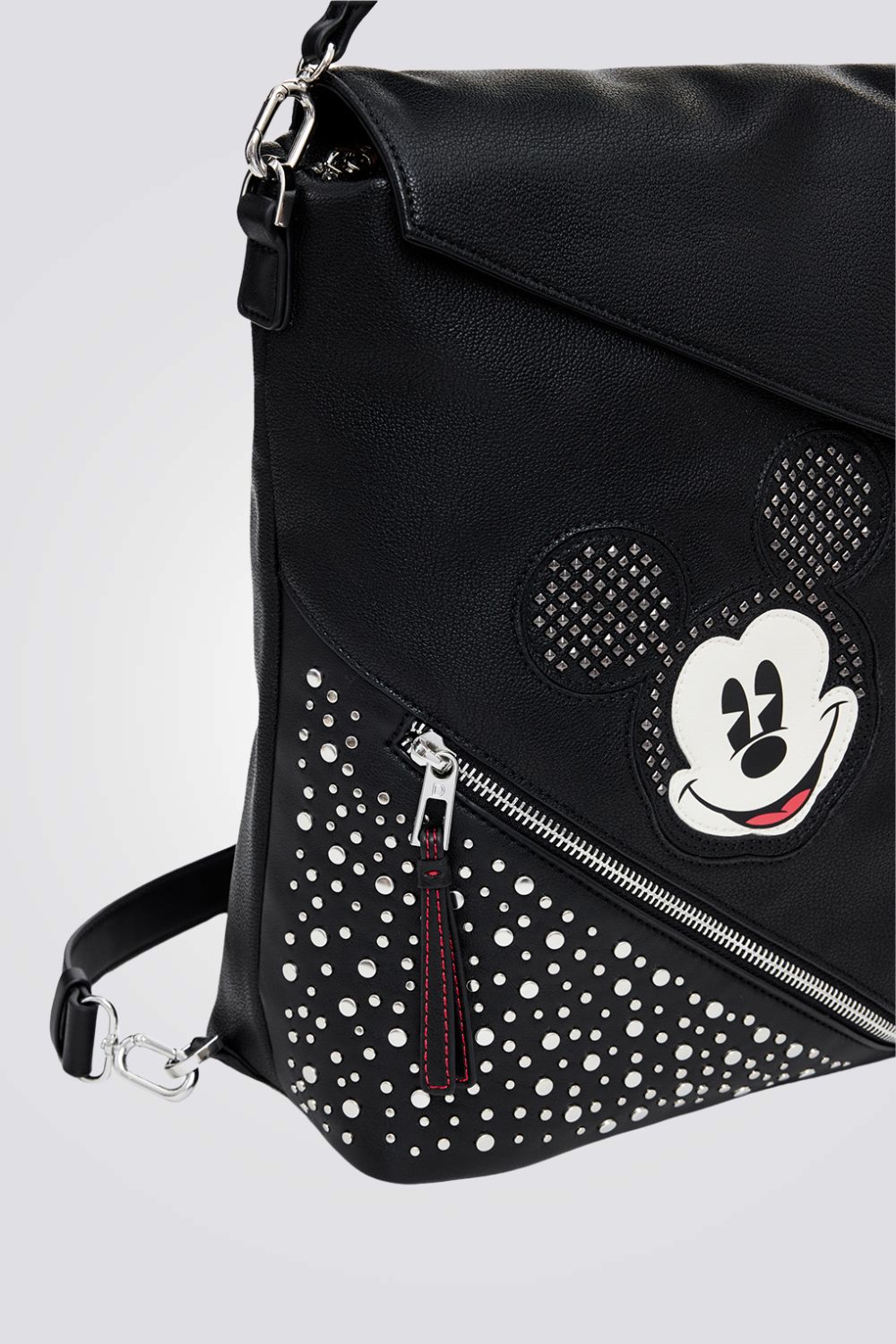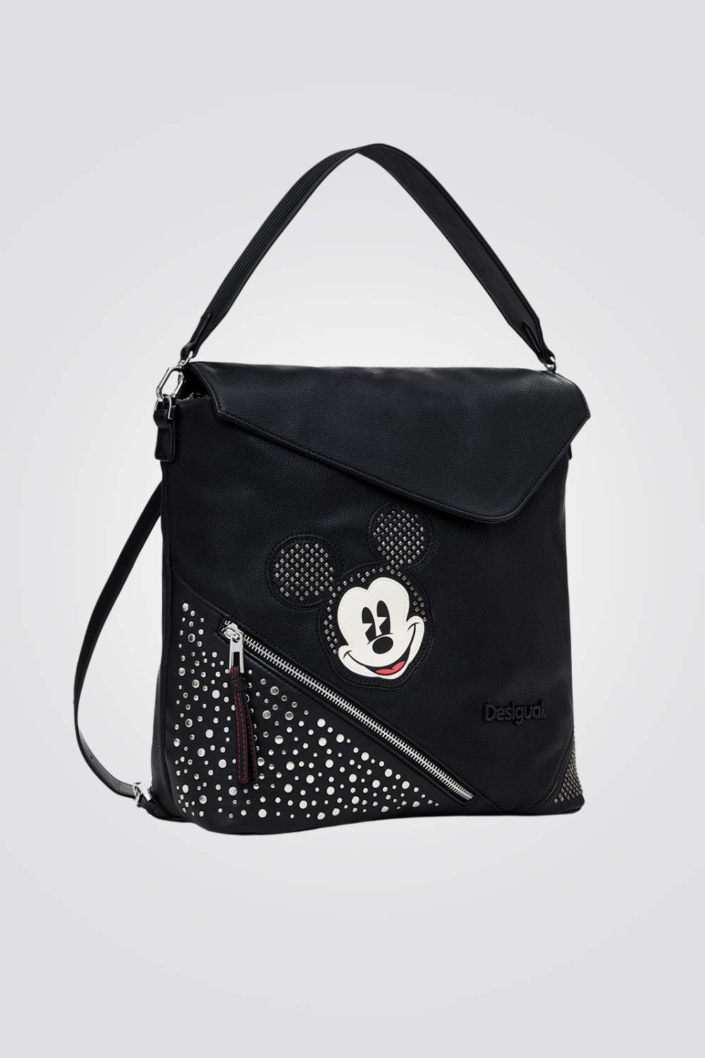 תיק גב לנשים מבית המותג DESIGUAL, בצבע שחור,בעיצוב מודרני עם דוגמא של מיקי מאוס ועיטורי ניטים, תא ראשי עם סגירת רוכסן , שתי רצועות גב ועוד רצועת יד קטנה .