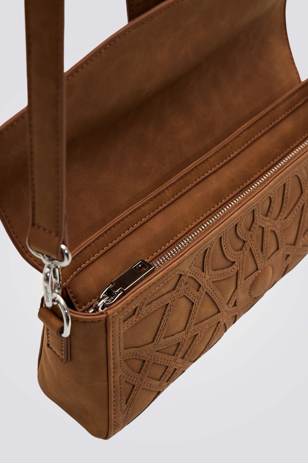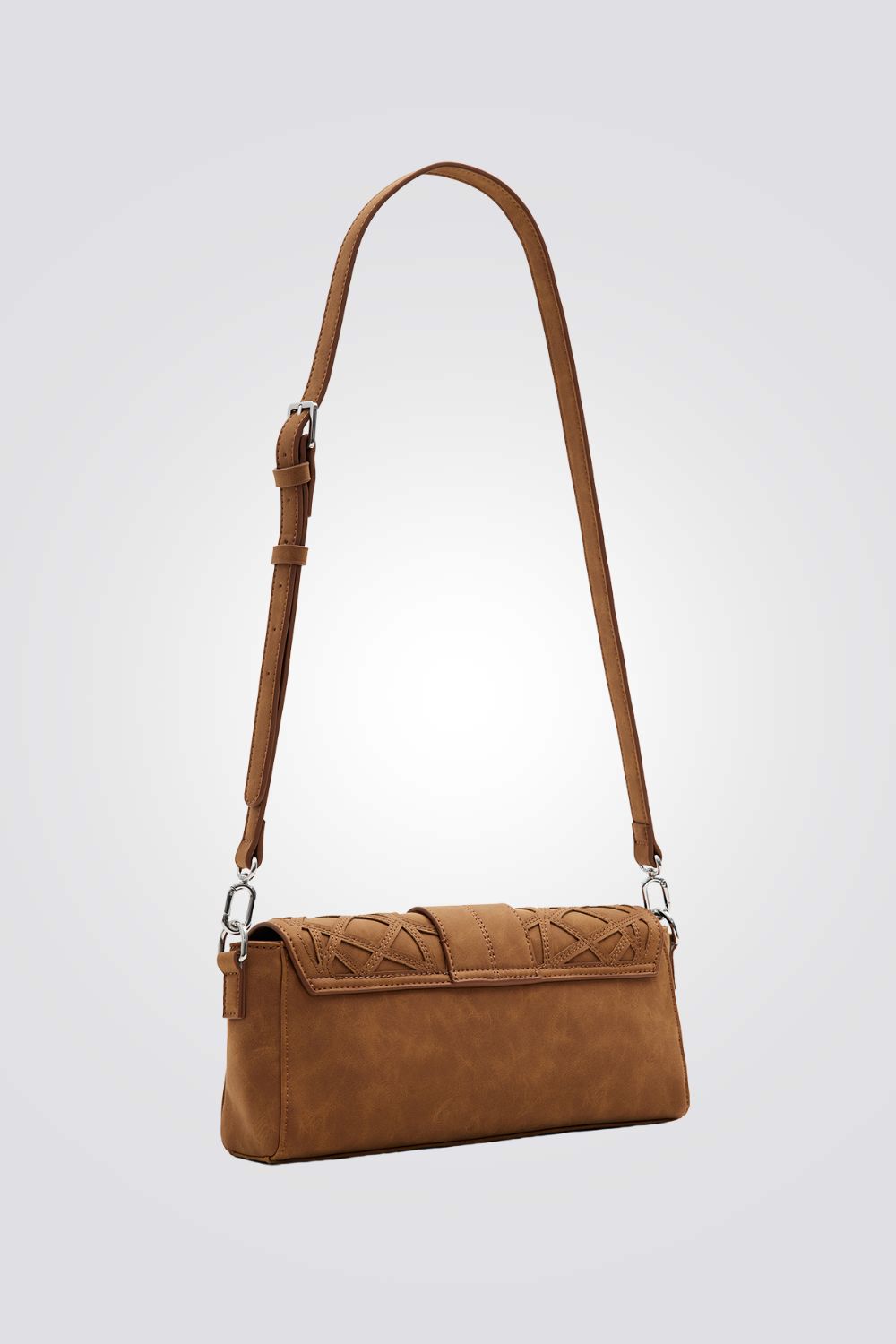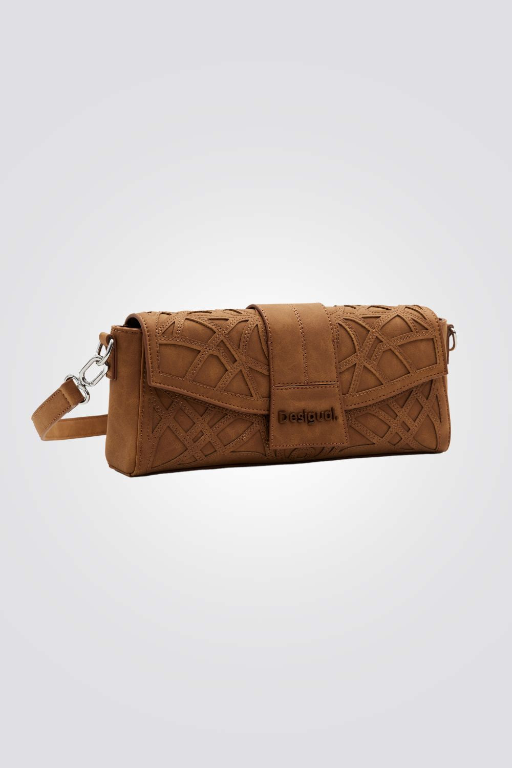 תיק צד לנשים מבית המותג DESIGUAL, בצבע חום, בעיצוב מודרני עם העיטורים מוטבעים על התיק, תא עם סגירת רוכסן ורצועת צד.
