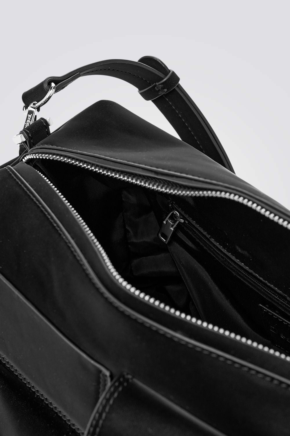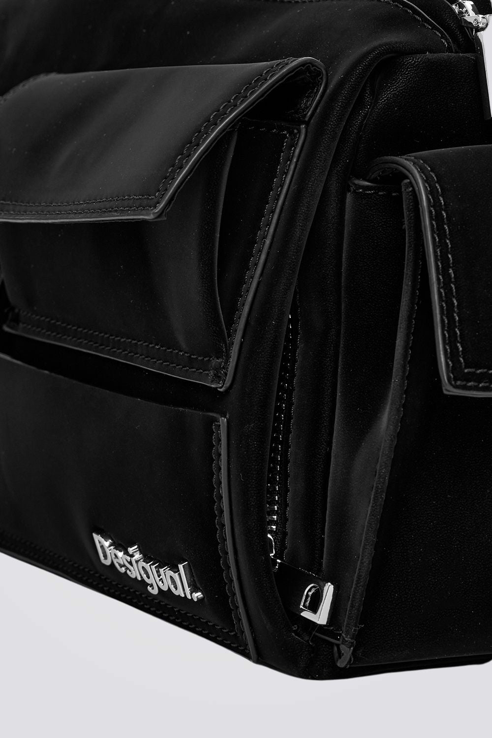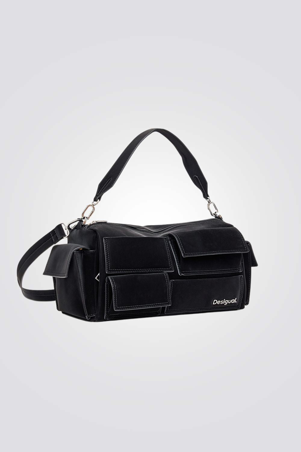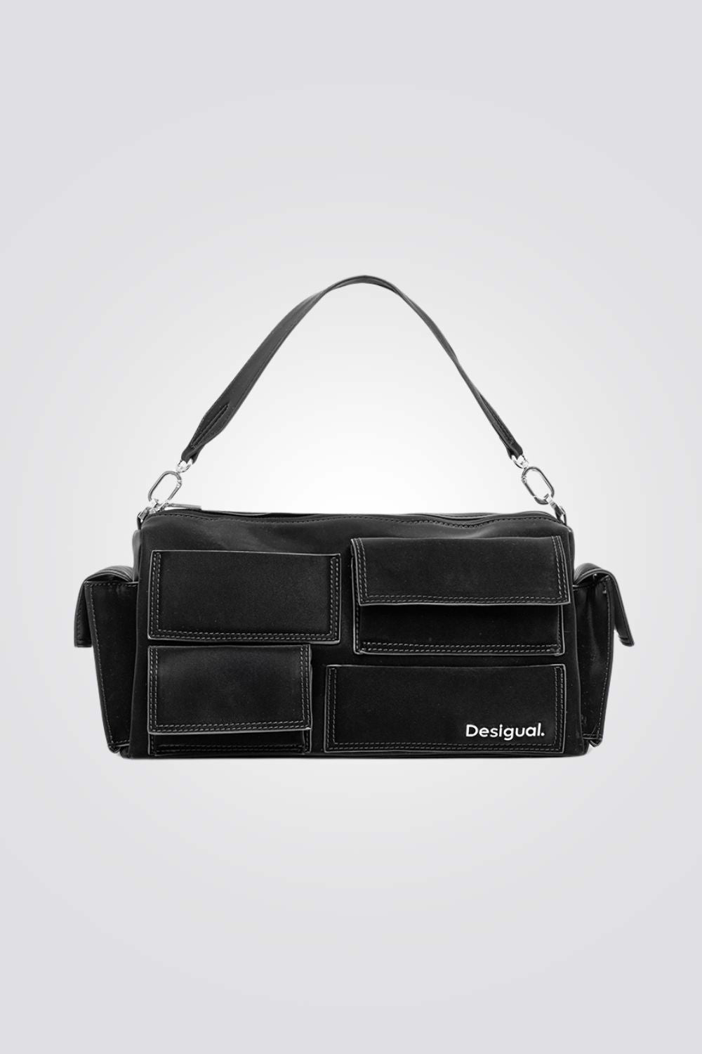 תיק יד לנשים מבית המותג DESIGUAL, בצבע שחור, בעיצוב מודרני תא ראשי עם סגירת רוכסן, ועוד תאים חיצוניים רטנים, רצועת יד לנשיאה ועוד רצועת צד.