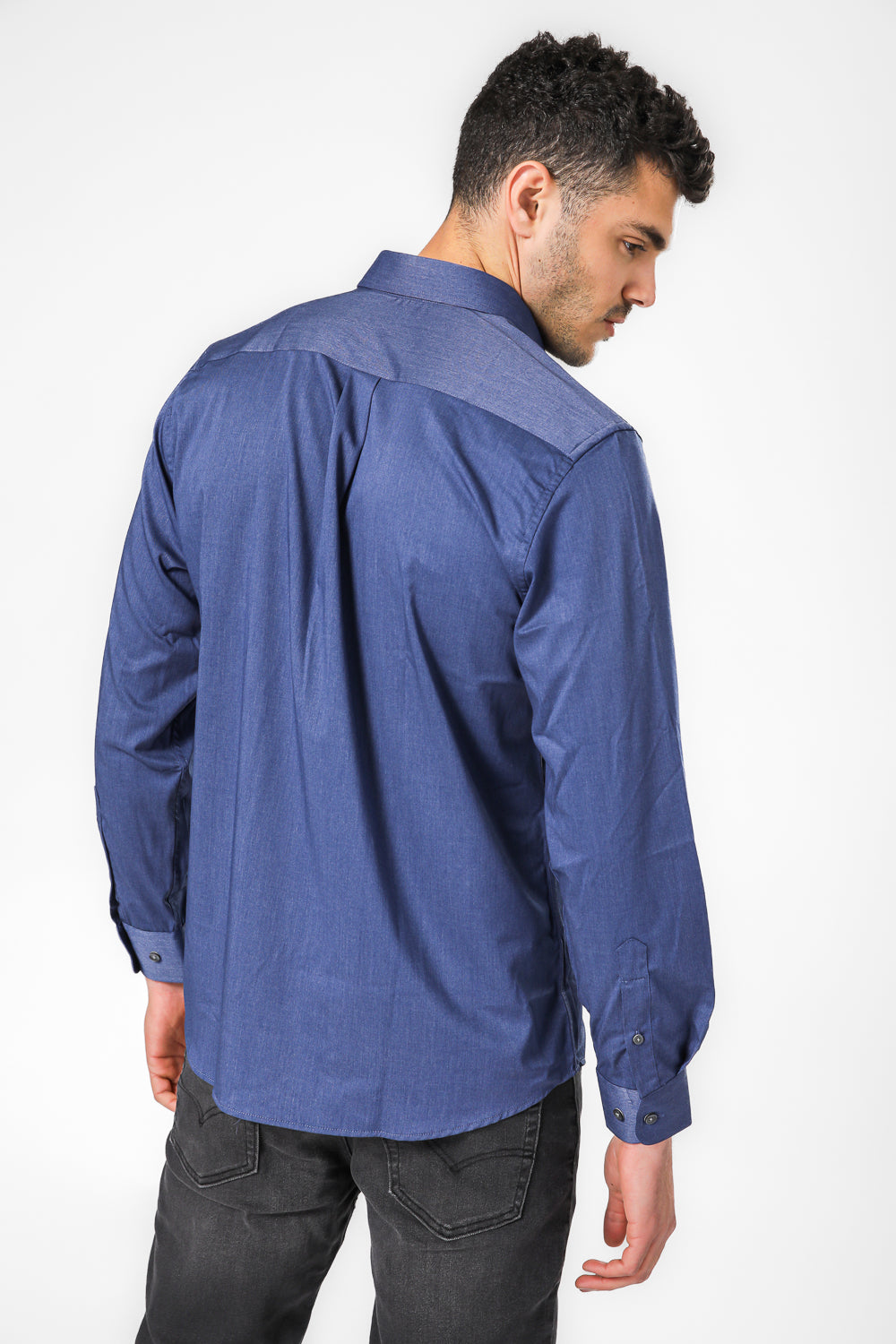 חולצה מכופתרת לגברים מבית המותג SCORCHER בצבע ג'ינס בגזרה קלאסית עם שרוולים ארוכים וכיס קדמי.