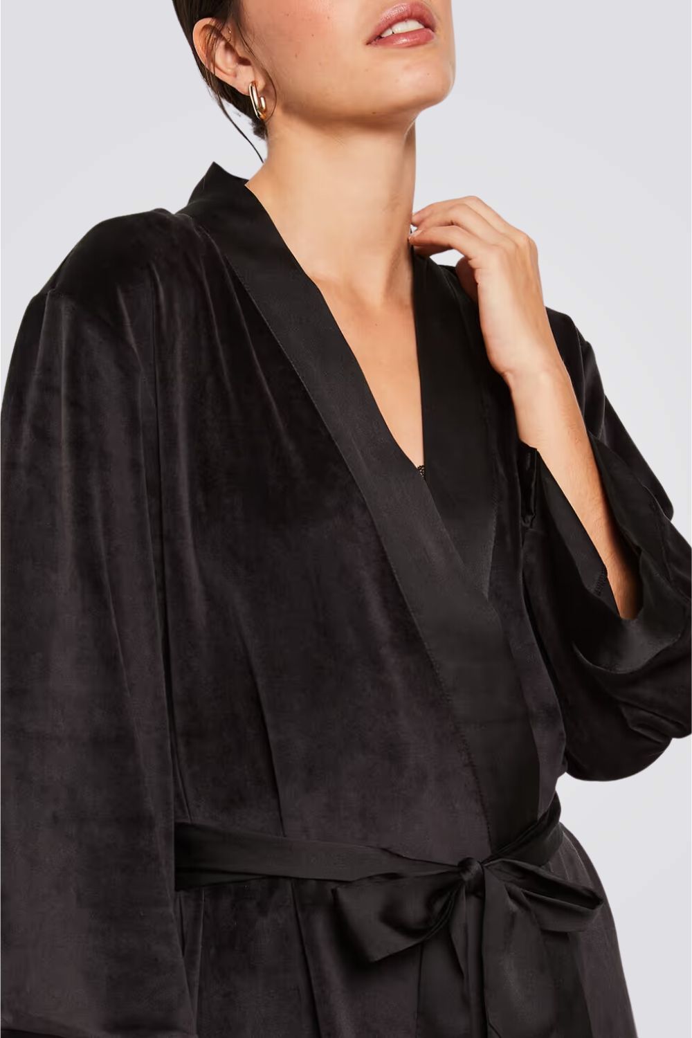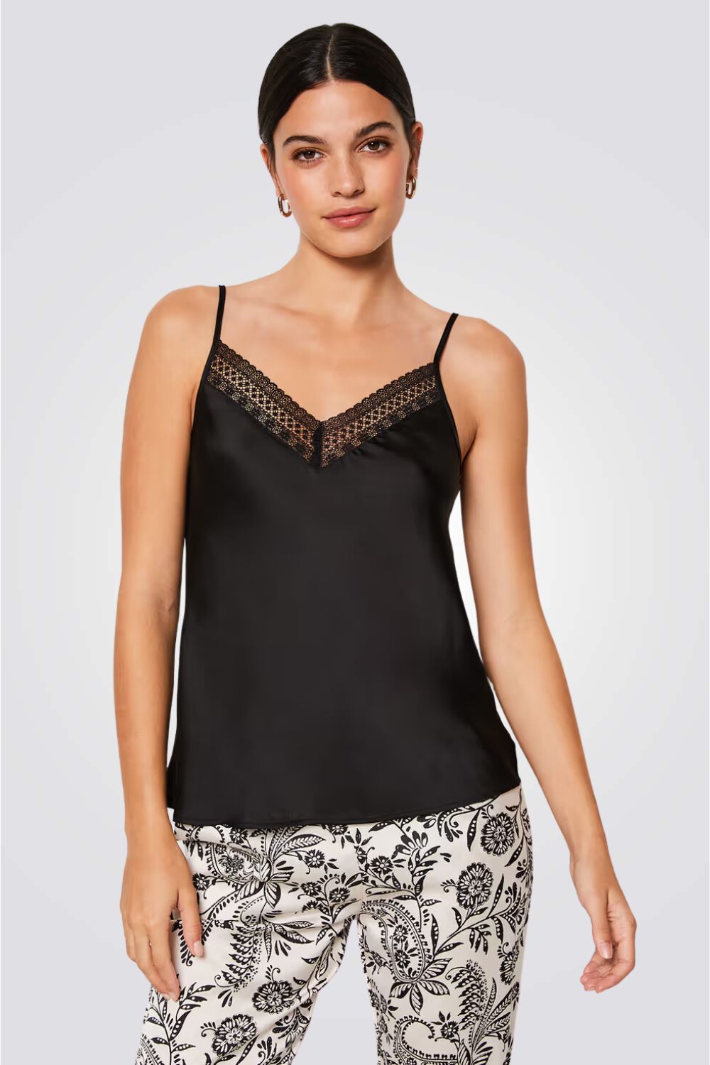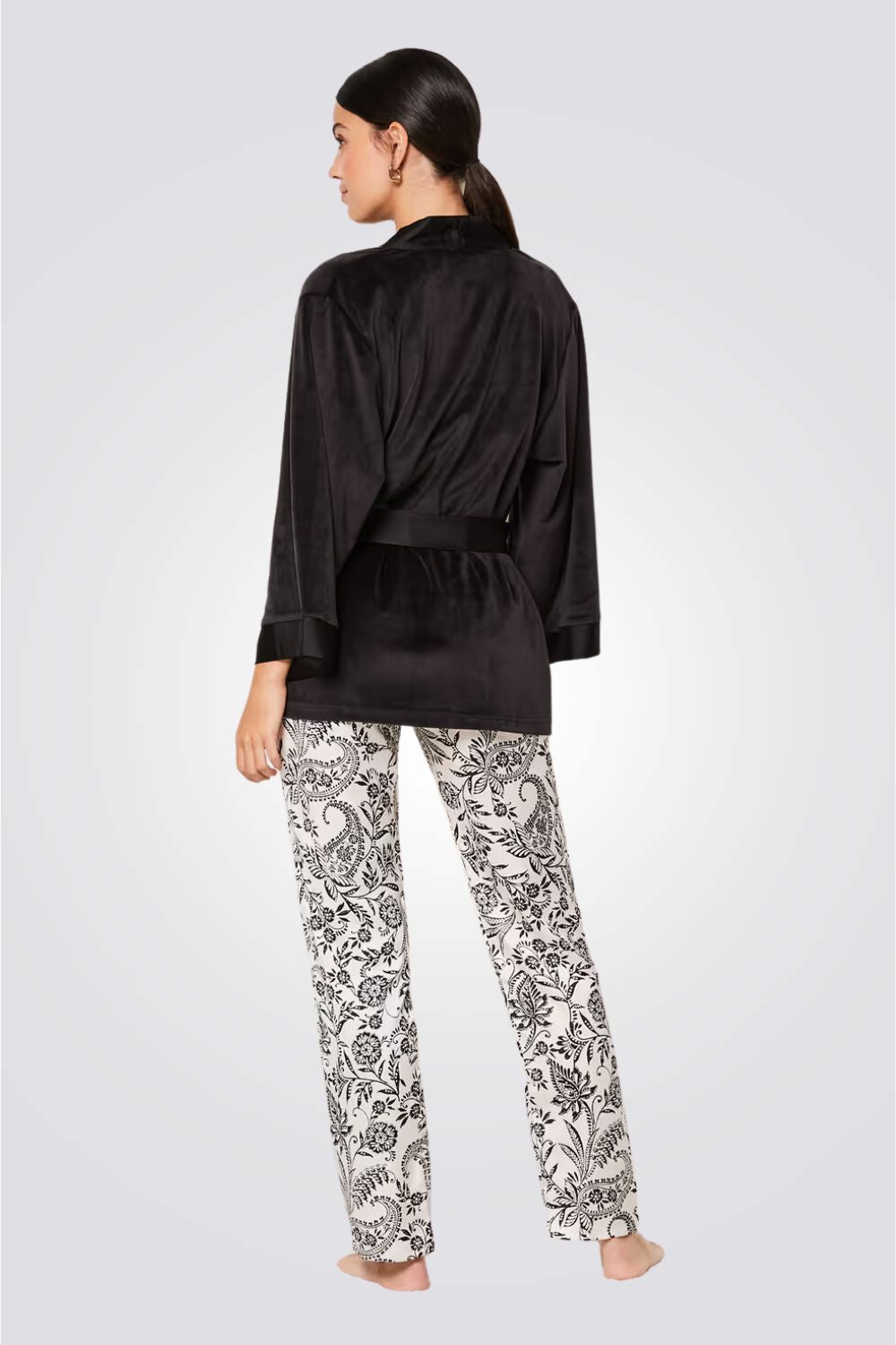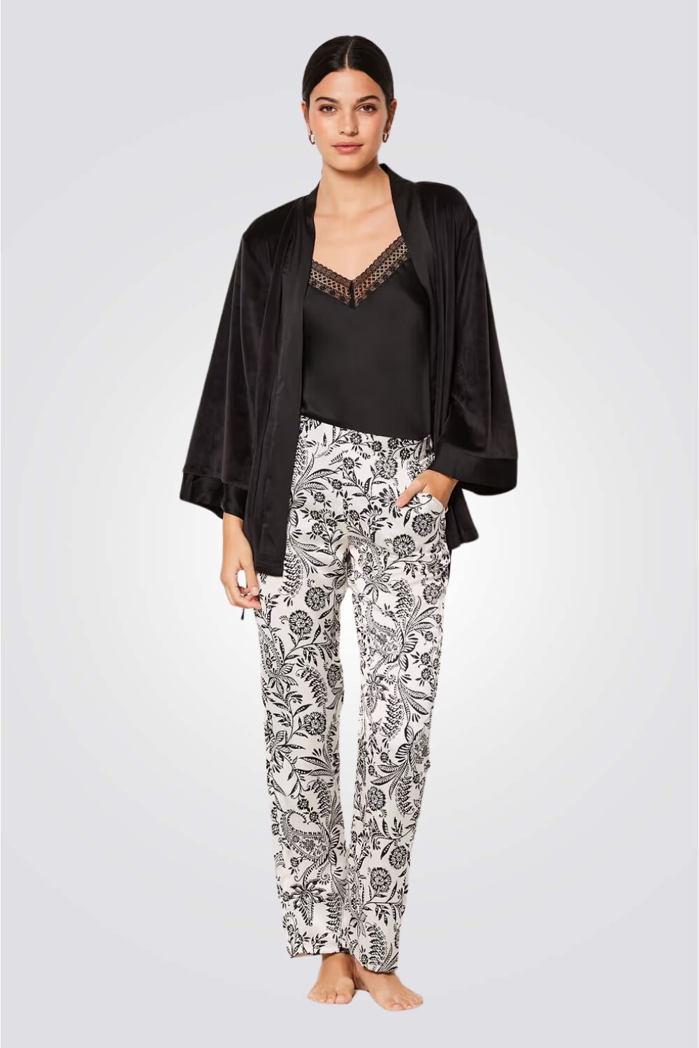 סט פיג'מה לנשים מבית המותג הצרפתי ETAM, סר המורכב משלושה חלקים - מכנסיים ארוכים לבנים עם הדפס לבן, גופיית סאטן שחור עם עיטורי תחרה בקו המחשוף ומחלוק קצר עם שרוולים ארוכים ושרוך קשירה.