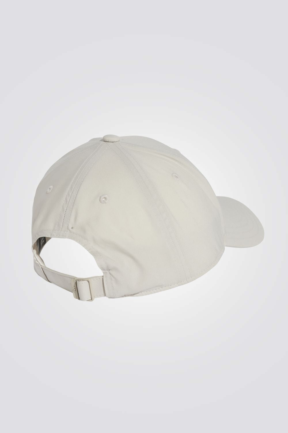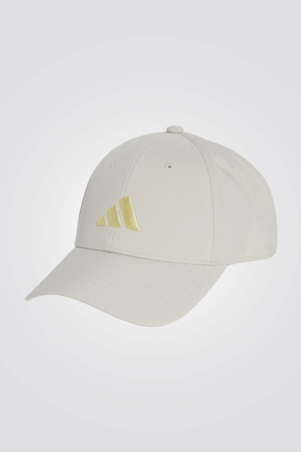 כובע בייסבול מבית המותג ADIDAS בצבע בז', בעל מצחייה בינונית ושוליים מעוקלים, רצועה מתכווננת במאחורי הכובע וסמל המותג רקום בזהב מקדימה.