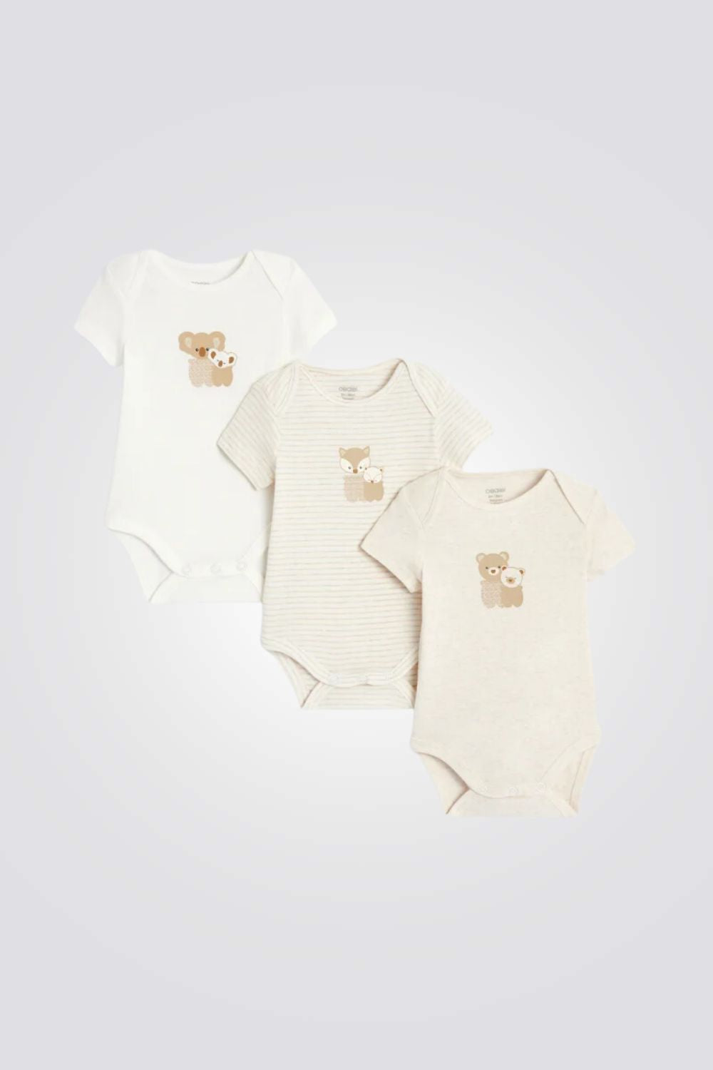 מארז שלושה בגדי גוף לתינוקות מבית המותג OBAIBI, בצבעי בז' ולבן עם הדפס מתוק של חיות ,עם שרוולים קצרים וסגירת תיקתק.