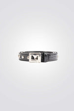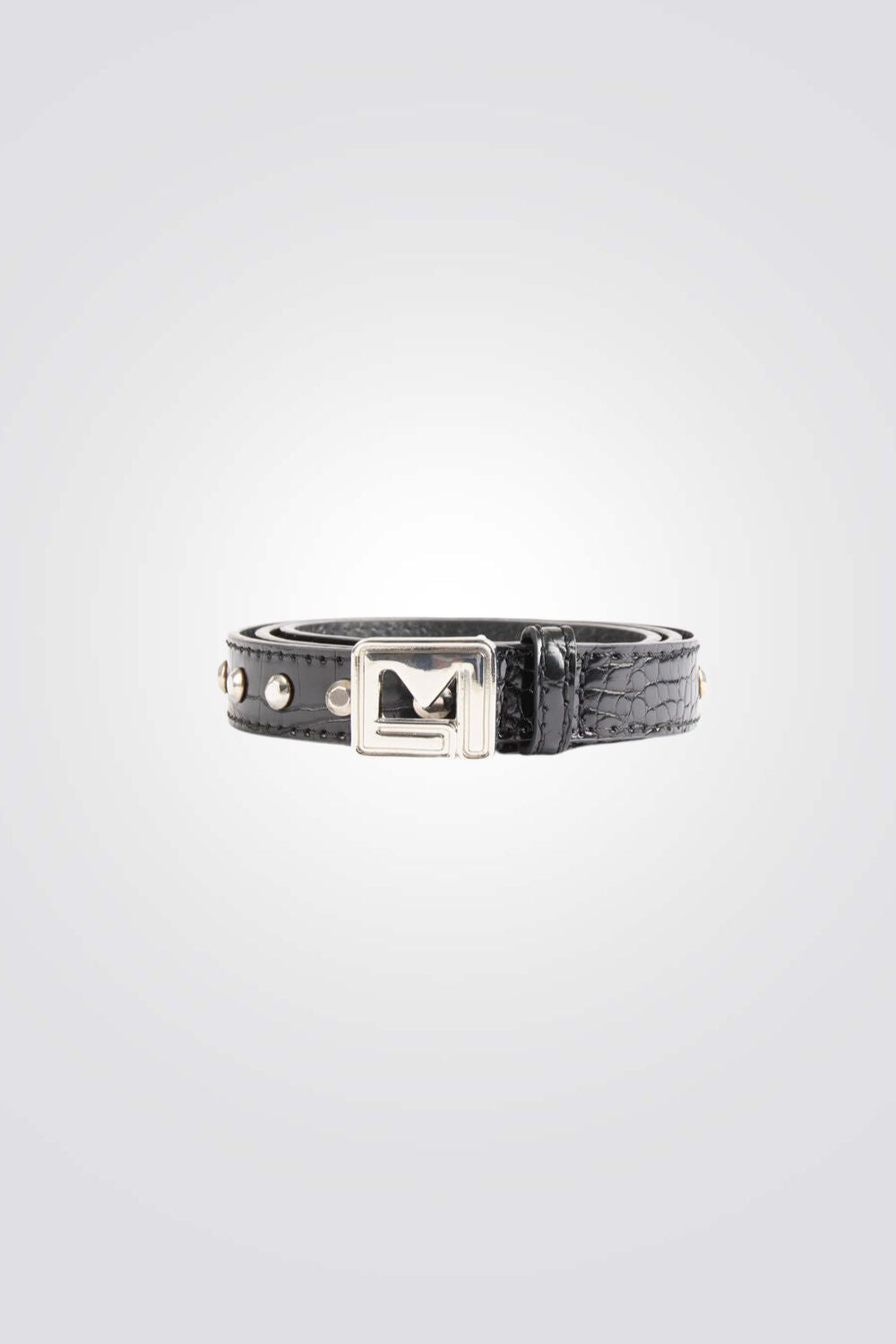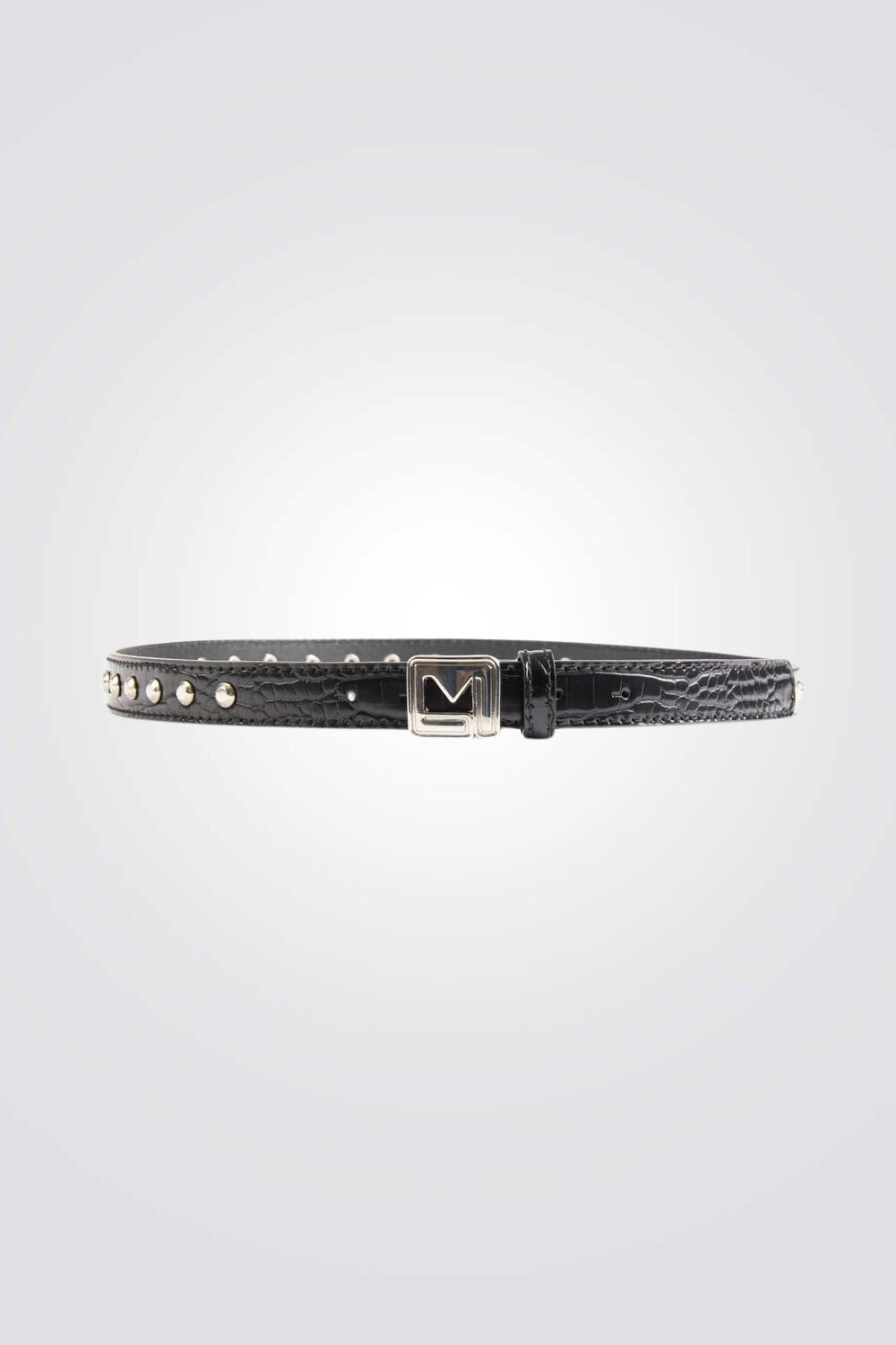 חגורה לנשים מבית המותג MORGAN בצבע שחור בטקסטורת קרוקודיל, עם ניטים ואבזם כסוף בצורת M.