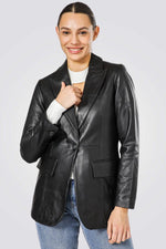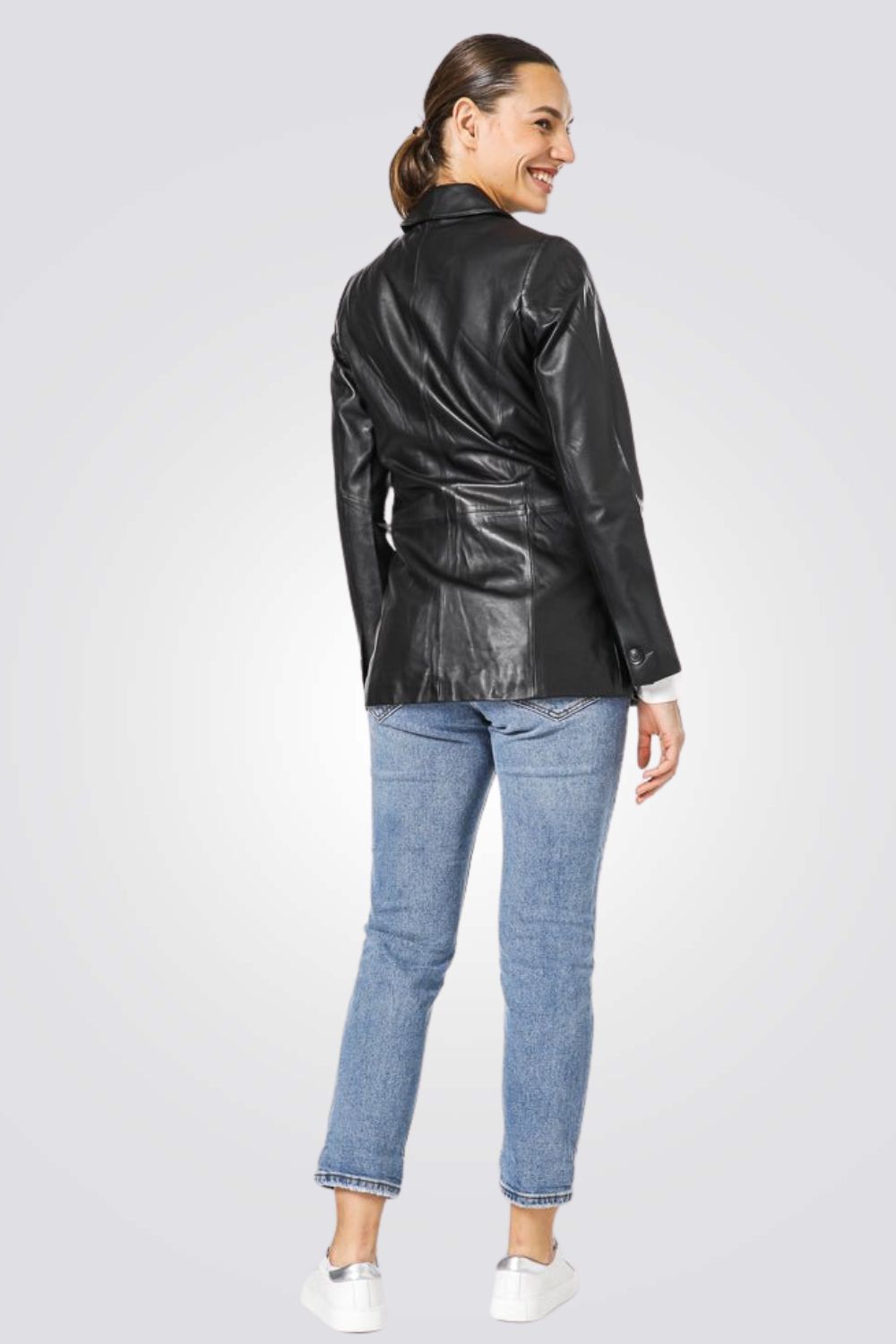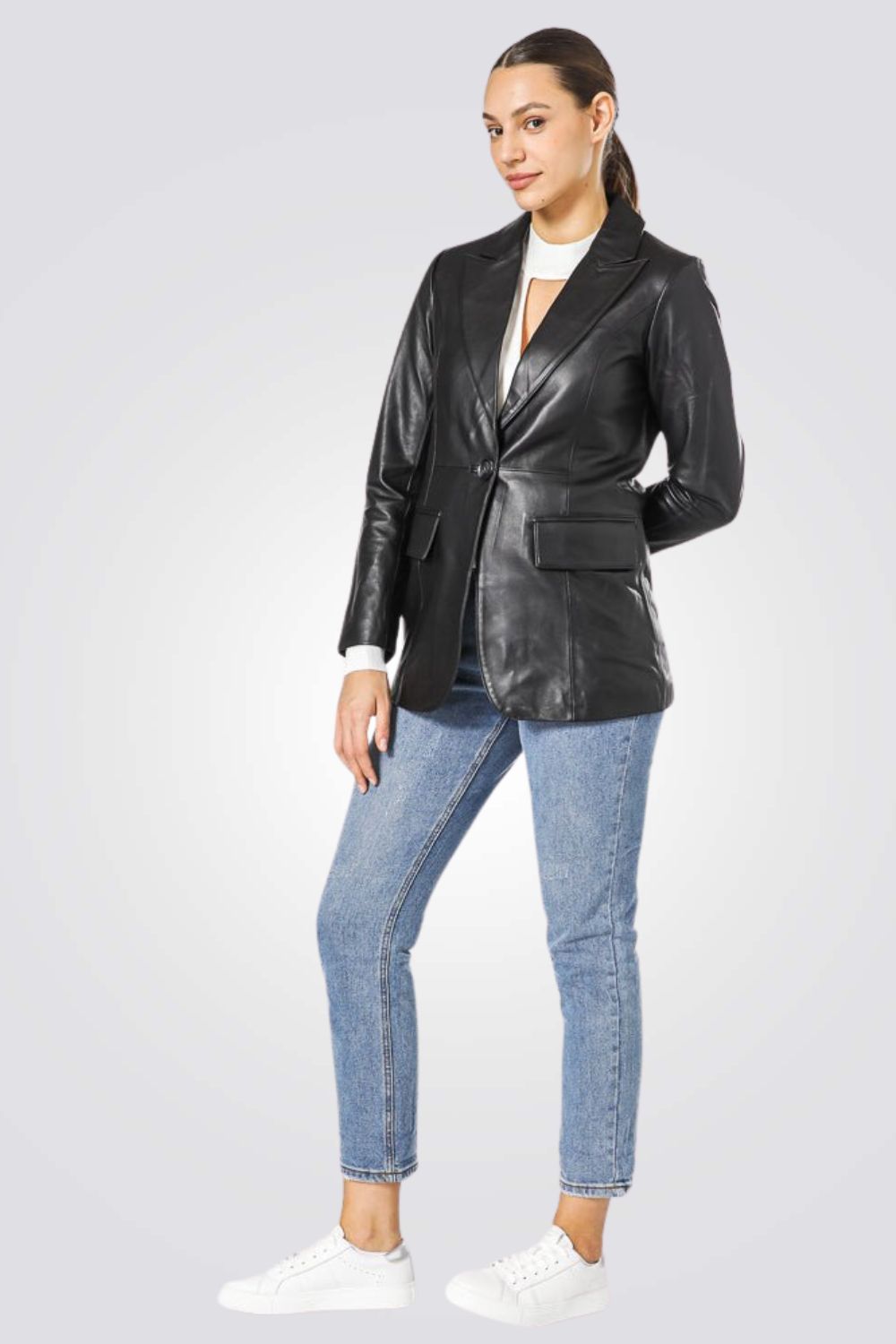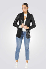 בלייזר מבית המותג KENNETH COLE לנשים בצבע שחור, עשוי מעור איכותי בגימור מבריק קלות למראה אלגנטי, מעוצב בגזרה מחויטת, בעל שרוולים ארוכים עם סיומת כפתור, צווארון קלאסי, סגירת כפתר בחזית ושני כיסים דקורטיביים בצדדים.