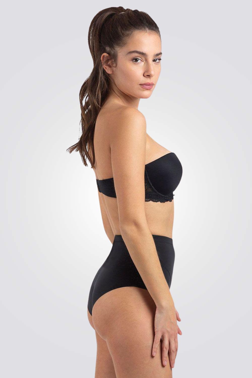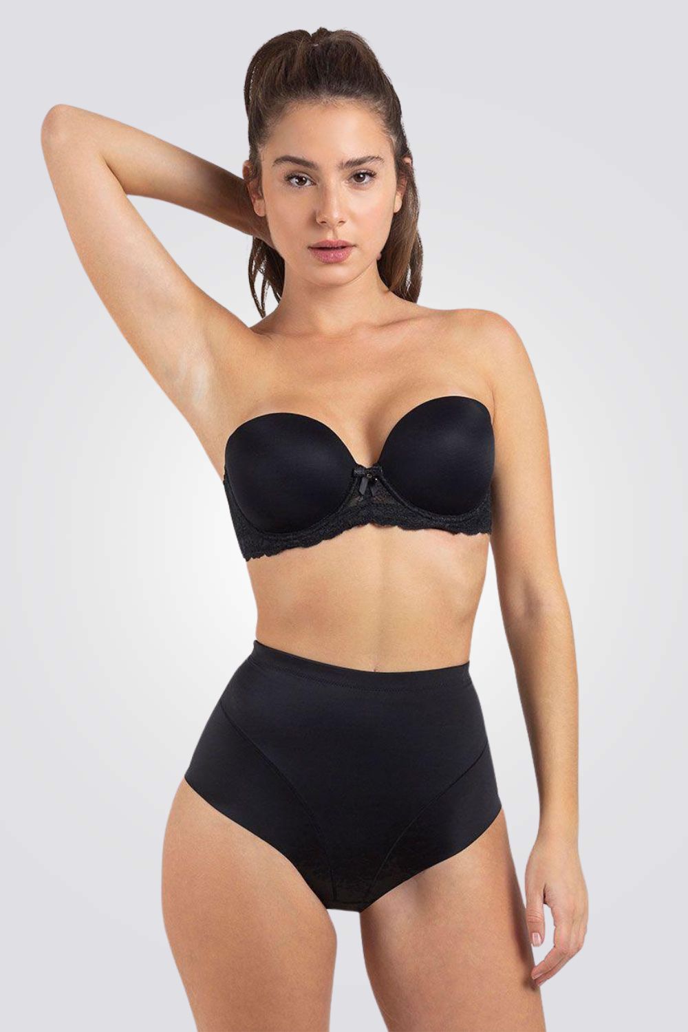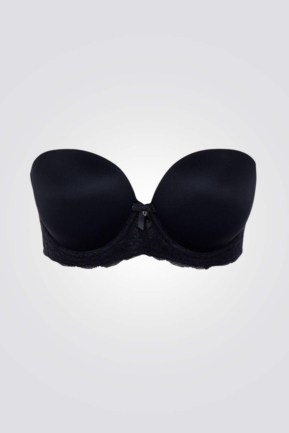 חזיית סטרפלס מבית המותג FEMINA לנשים בצבע שחור, בעלת ברזלים, כתפיות נשלפות ומתכווננות להתאמה אישית ועשויה מבד מיקרופייבר חלק שאינו בולט מתחת לבגדים.
