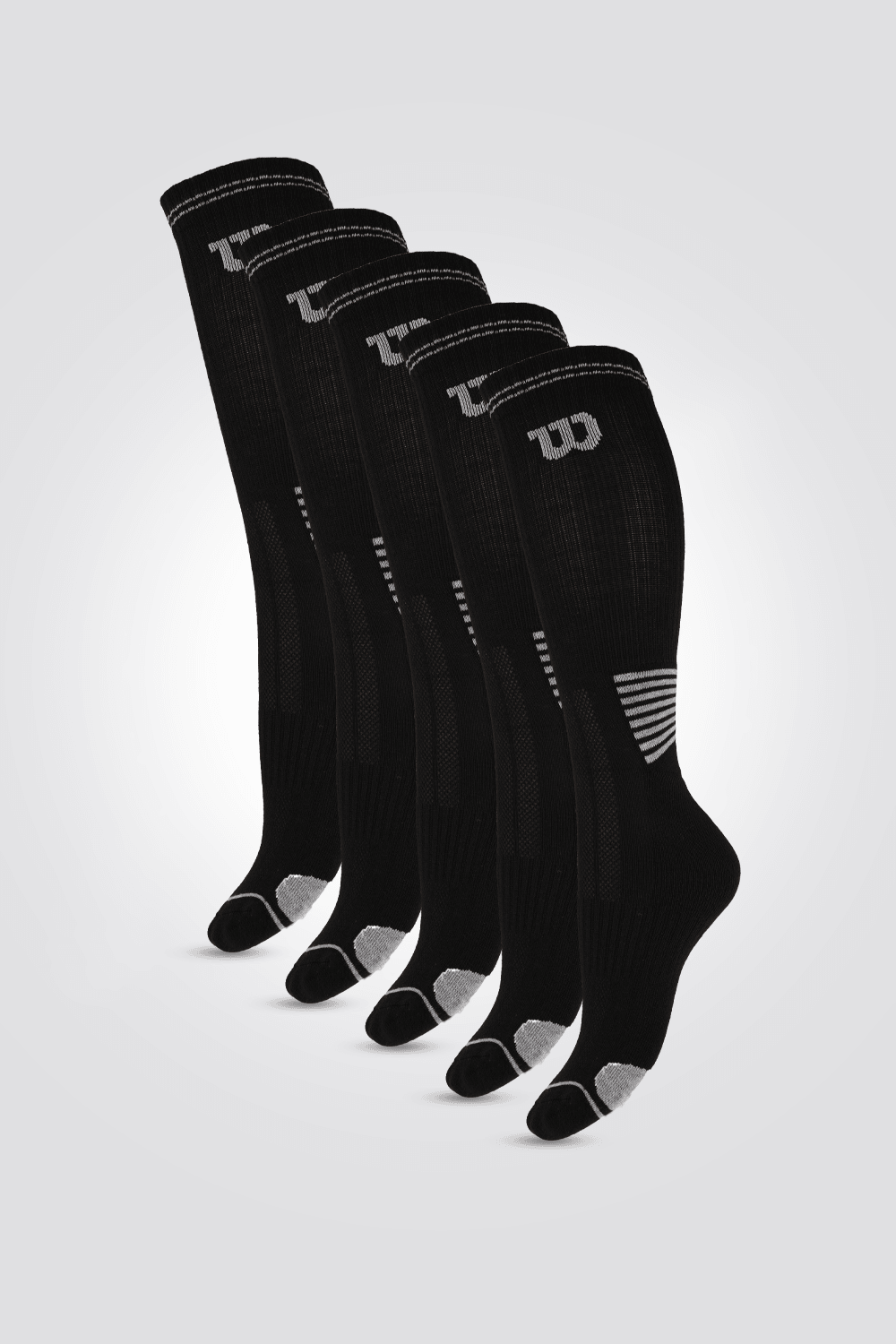 מארז 5 זוגות גרביים ספורטיביות לגברים באורך קלאסי מבית WILSON, בעיצוב ארגונומי התומך בכף הרגל ומעניק אחיזה טובה לקרסול, בשילוב בד רשת נושם ומאוורר.