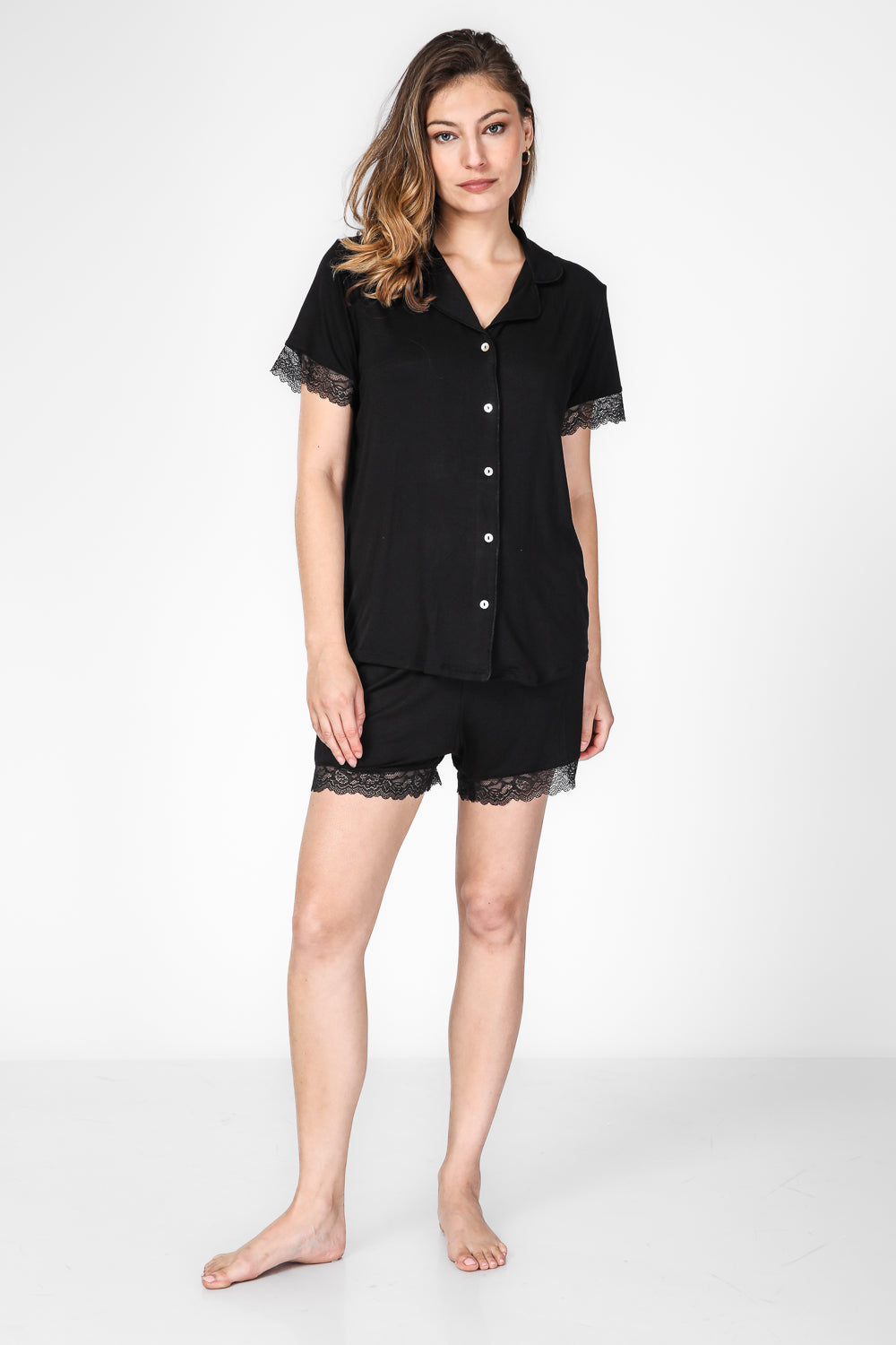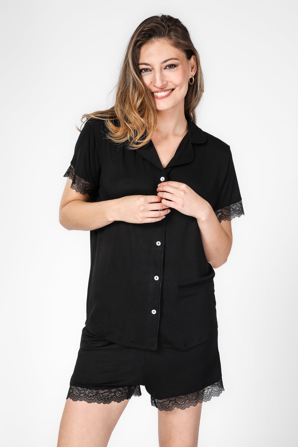 סט פיג'מה מכופתרת לנשים בצבע שחור