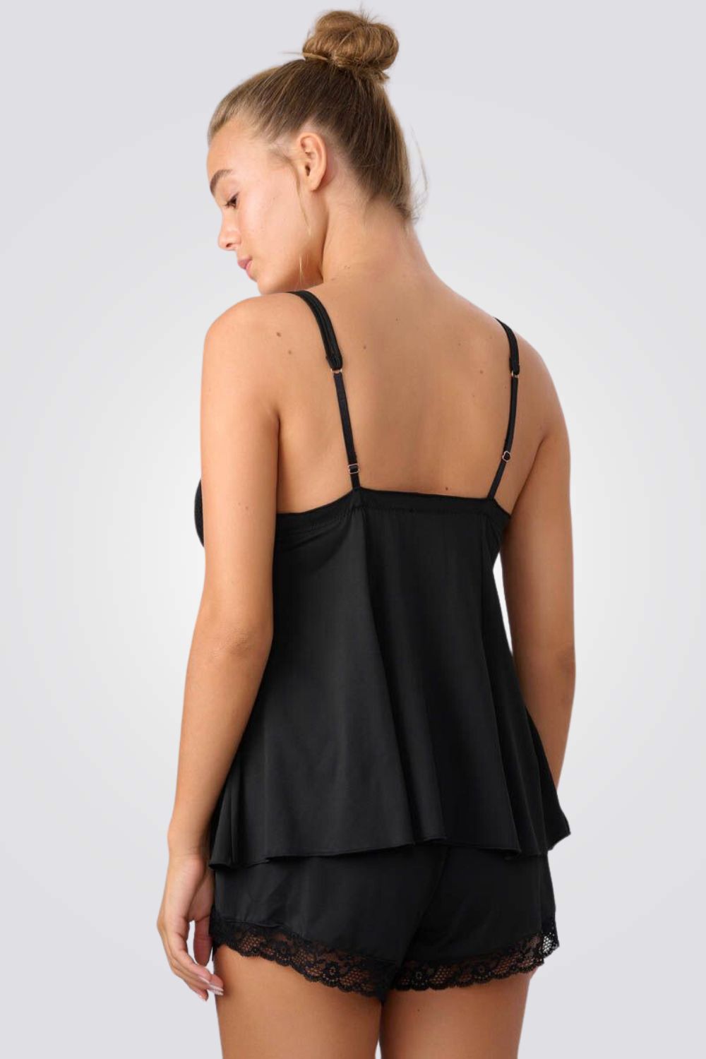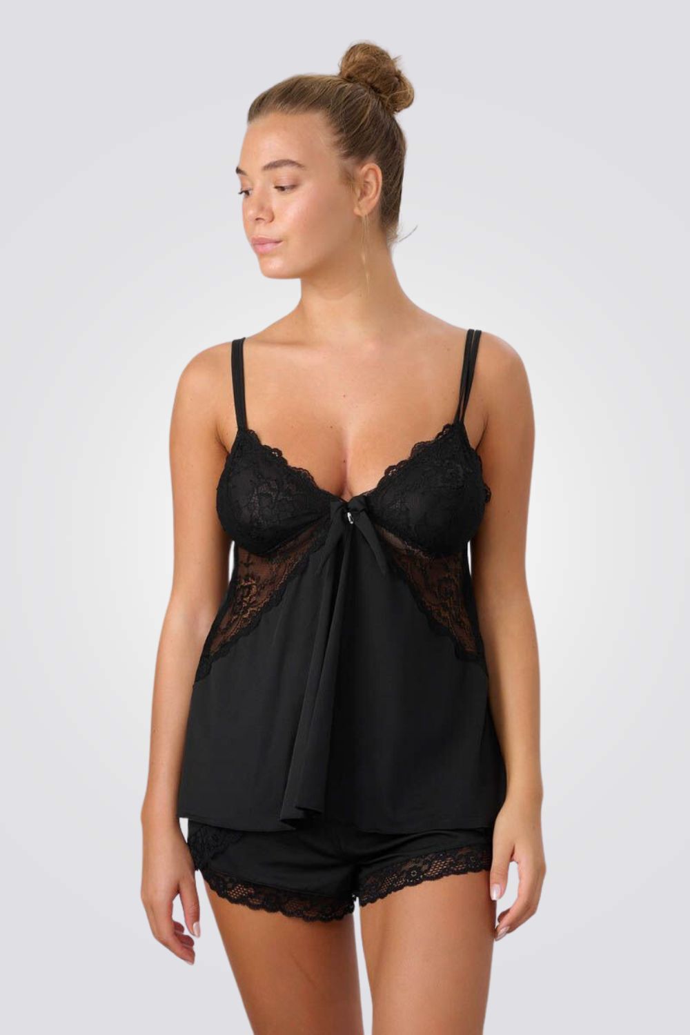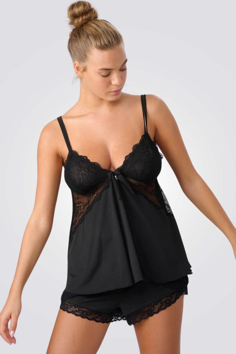 סט בייבי דול מבד מיקרופייבר נעים ואיכותי, בשילוב תחרה אלסטית: גופייה עם כתפיות דקות מתכווננות וקאפים בריפוד קל ומכנסיים קצרים בגזרה משוחררת.