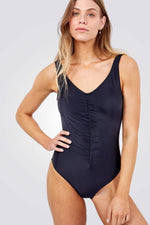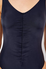 בגד ים מבית המותג PILPEL,בגד ים שלם בעל מפתח צוואר עגול עם מחשוף עמוק בגב וכיווצים באזור התחתון.