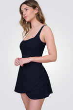 בגד ים שמלה מבית המותג TURKIZ בגזרה מחטבת, עם קאפים מובנים, גב פתוח ומחשוף מרובע