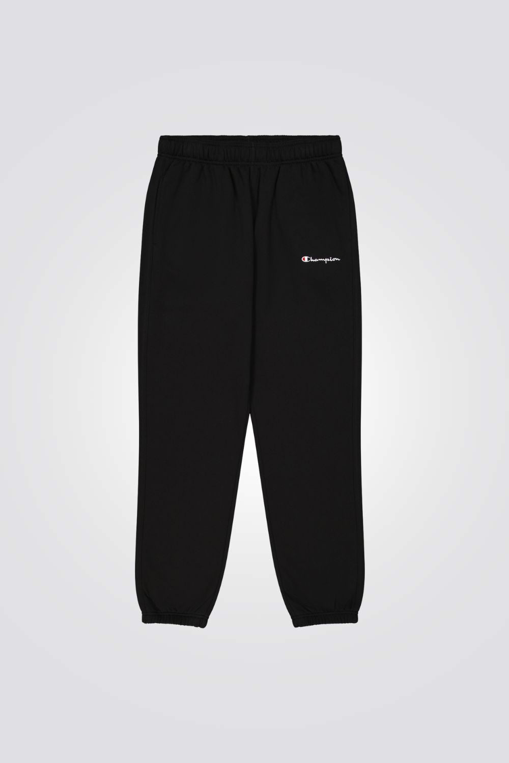 מכנסי טרנינג לגברים מבית המותג CHAMPION, בצבע שחור עם לוגו המותג, מותן אלסטית וסיומת גומי ברגליים.