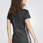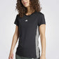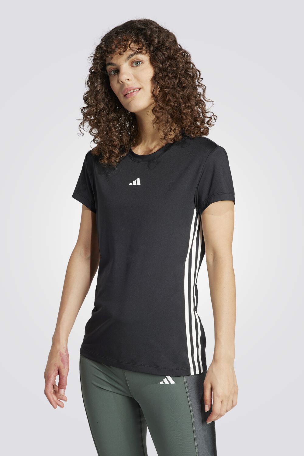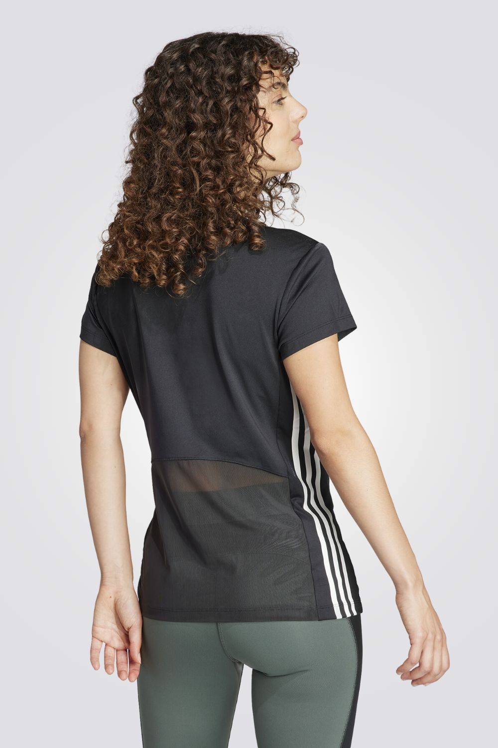 חולצת טריקו ספורט מבית המותג ADIDAS לנשים בצבע שחור, בעלת שרוולים קצרים, צווארון עגול, בטכנולוגיה AEROREADY מנדפי זיעה ובד רשת בגב החולצה למטה.