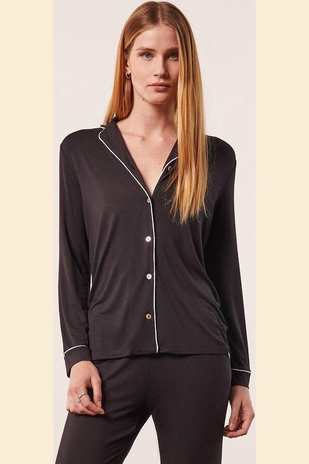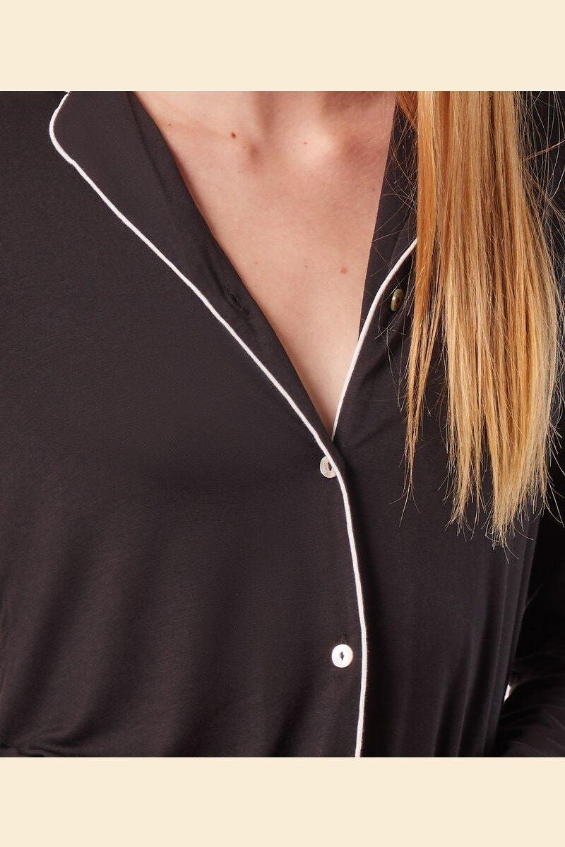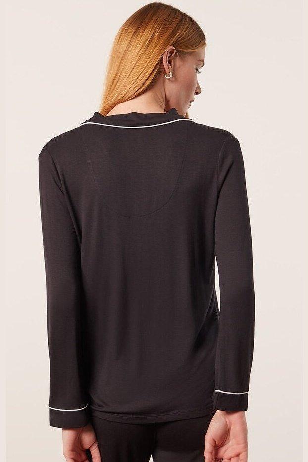 חולצת פיג'מה ארוכה של המותג ETAM, בצבע שחור בגימור פס עיטור דק בצבע לבן. עם צווארון דש וסגירת כפתורים קדמית. מכנסיים תואמים ניתנים לרכישה בנפרד.