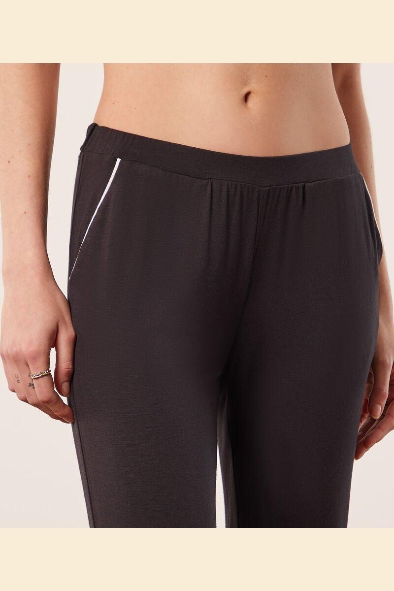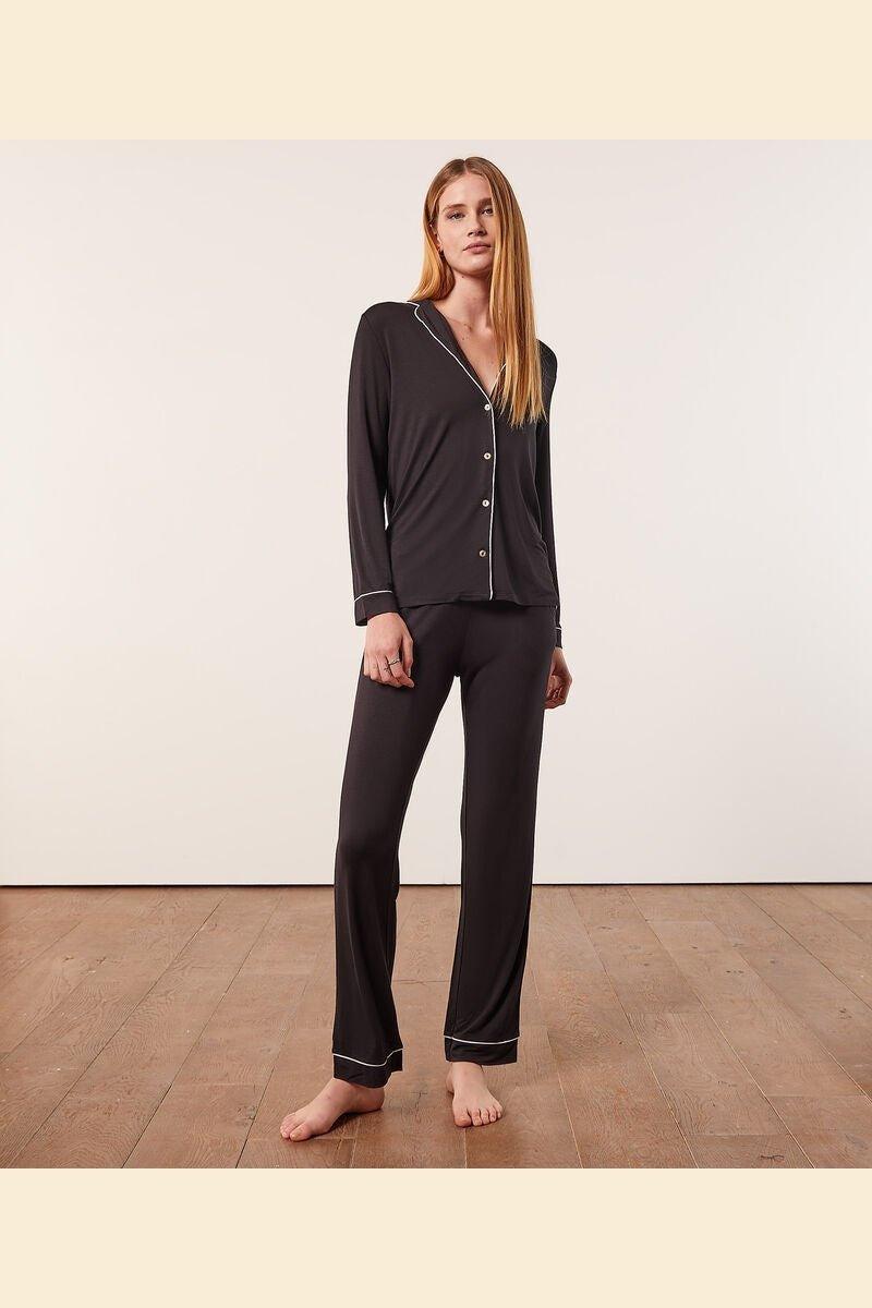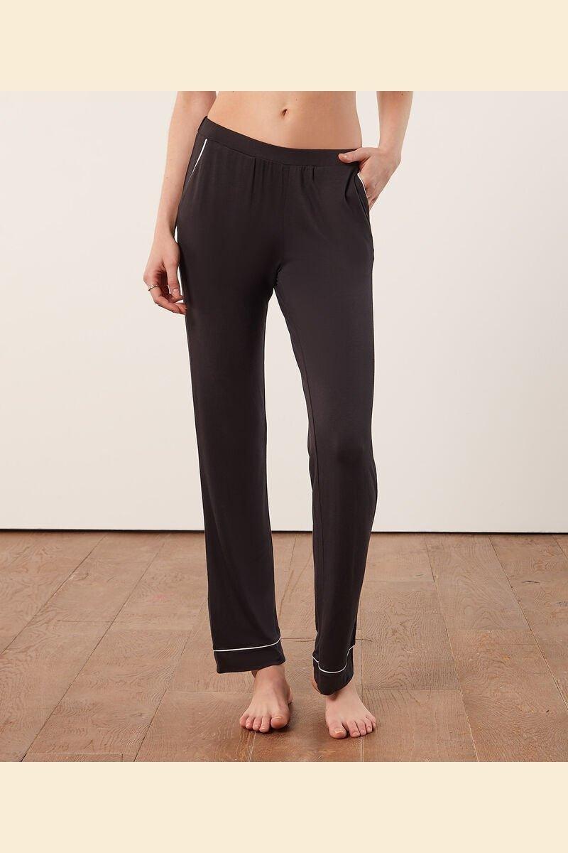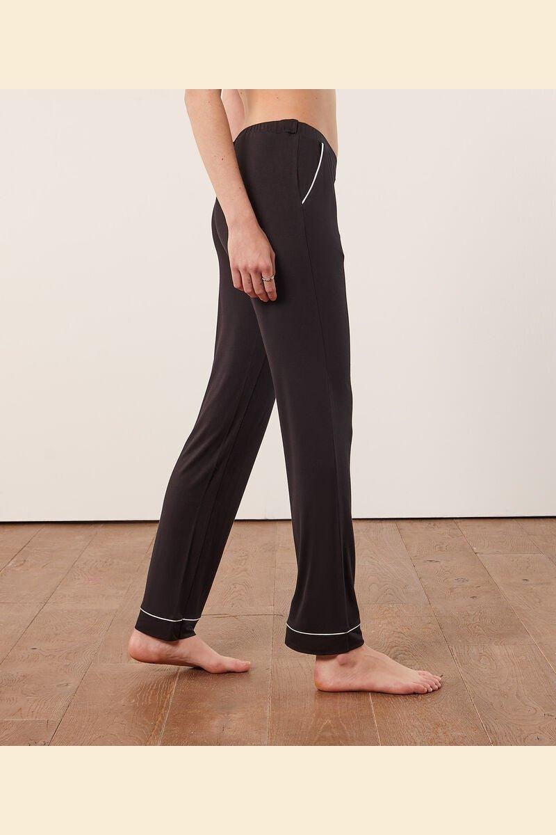מכנסי פיג'מה ארוכים של המותג ETAM. מכנסיים בצבע שחור בגימור פס עיטור לבן דק, בגזרה ישרה ונינוחה, עם מותן אלסטית ושני כיסים.