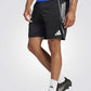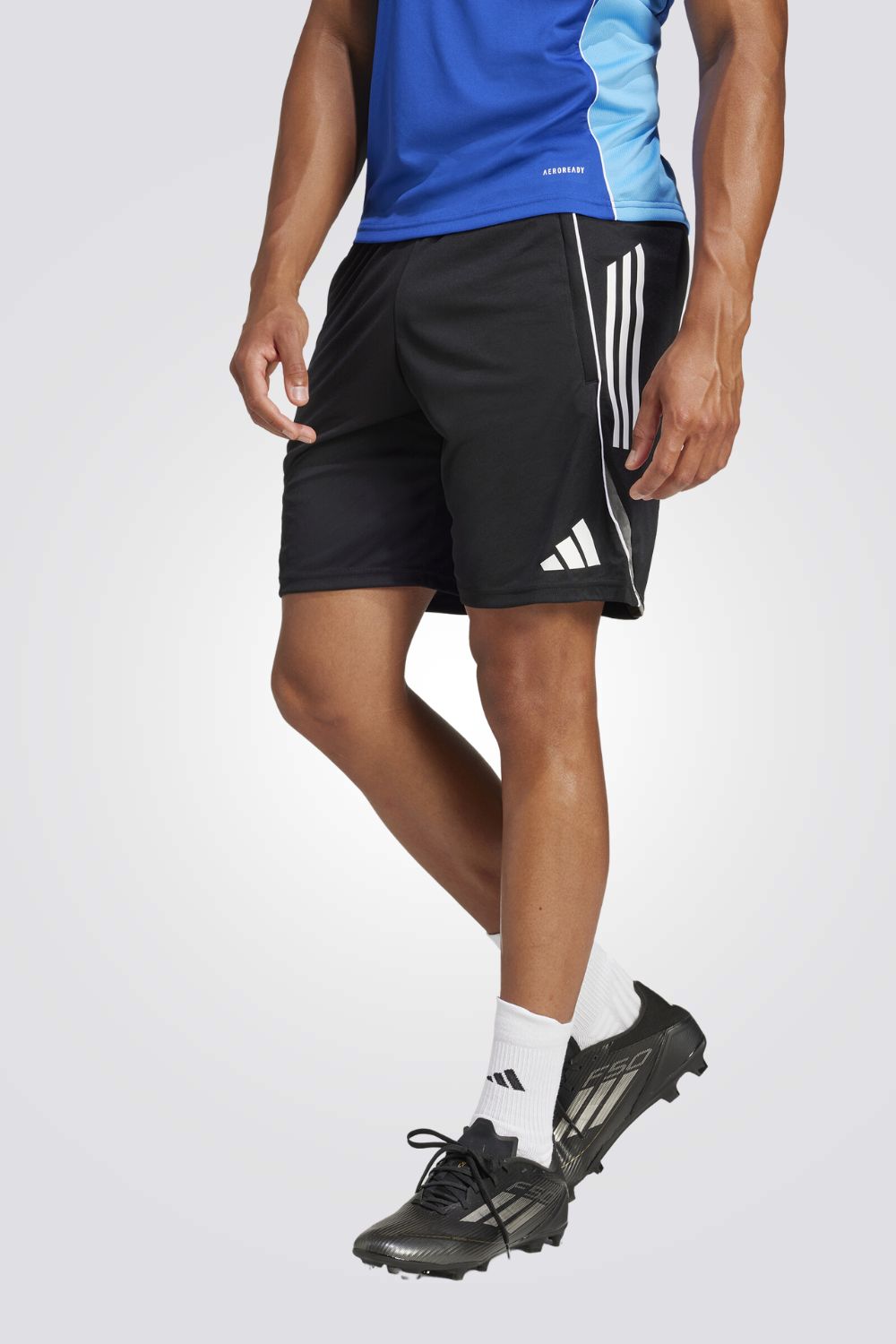 מכנס ספורט קצר מבית המותג ADIDAS לגברים בצבע שחור, בעל גומי אלסטי באיזור המותניים ושרוך לקשירה פנימי, כיסים בצידי המכנס ושלושה פסים בצבע לבן בצידי המכנס.