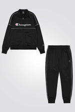 חליפת פוטר לגברים מבית המותג CHAMPION, בצבע שחור, מחממת ונעימה , סווטשירט עם לוגו המותג, סגירת רוכסן עם צווארון גבוהה ושני כיסים צדדיים, ומכנסיים עם מותן אלסטית וסיומת גומי ברגליים.