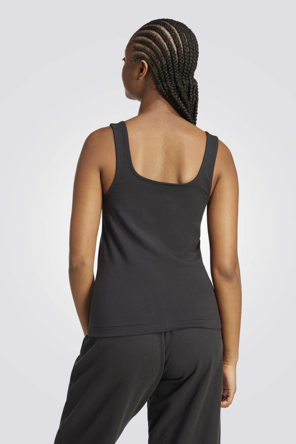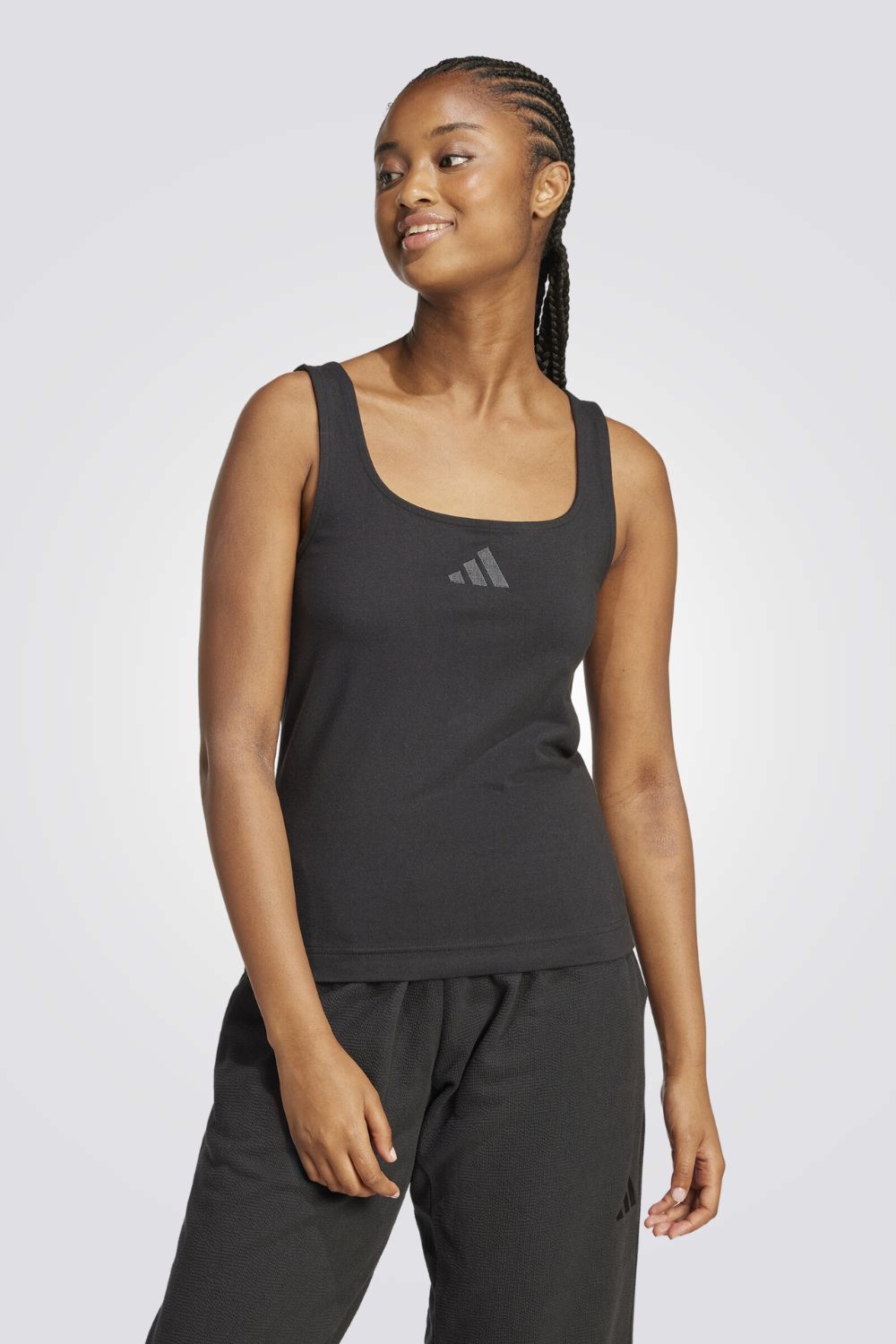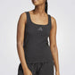 גופיה מבית המותג ADIDAS לנשים בצבע שחור, מבד קליל, כתפיות דקות וסמל המותג שחור רקום בקידמת הגופיה.