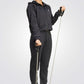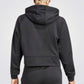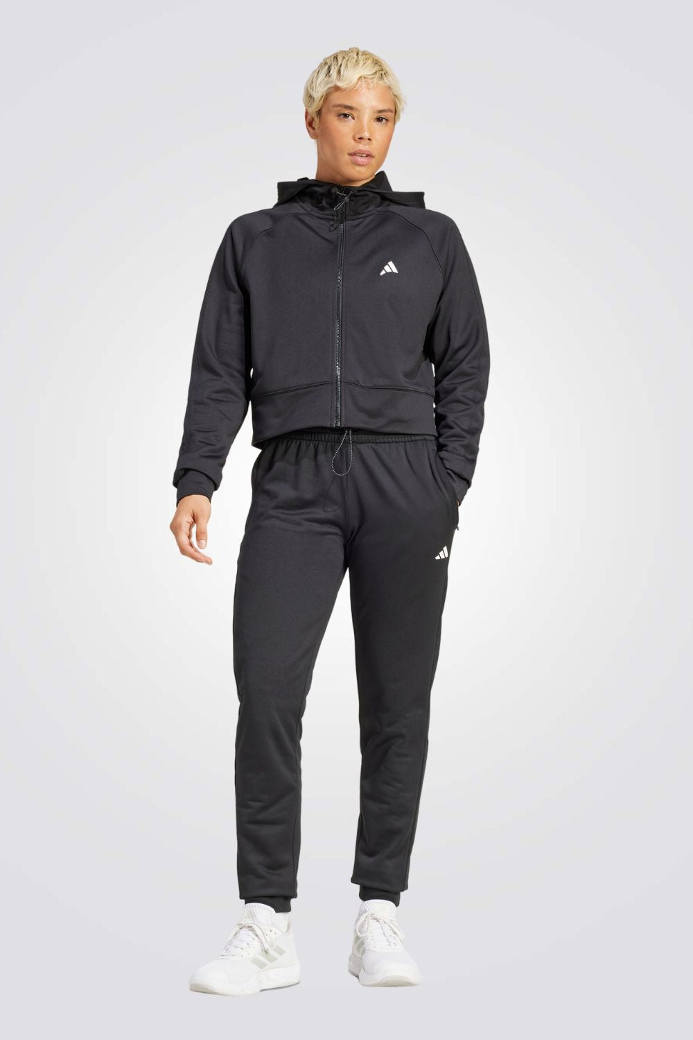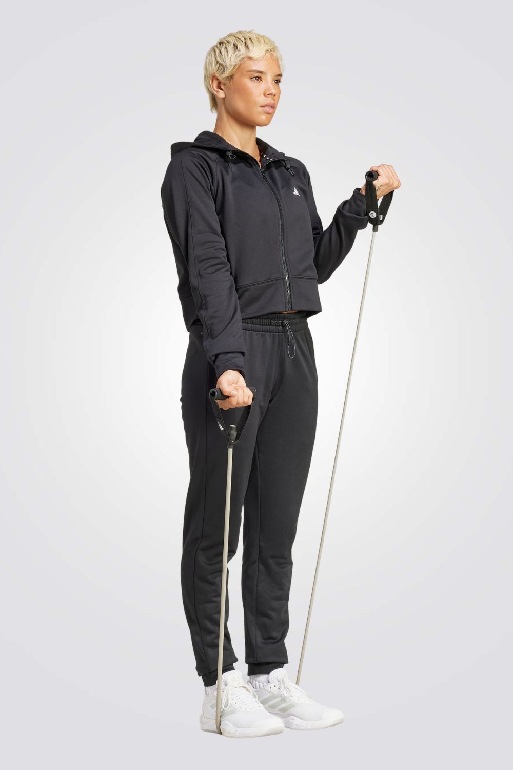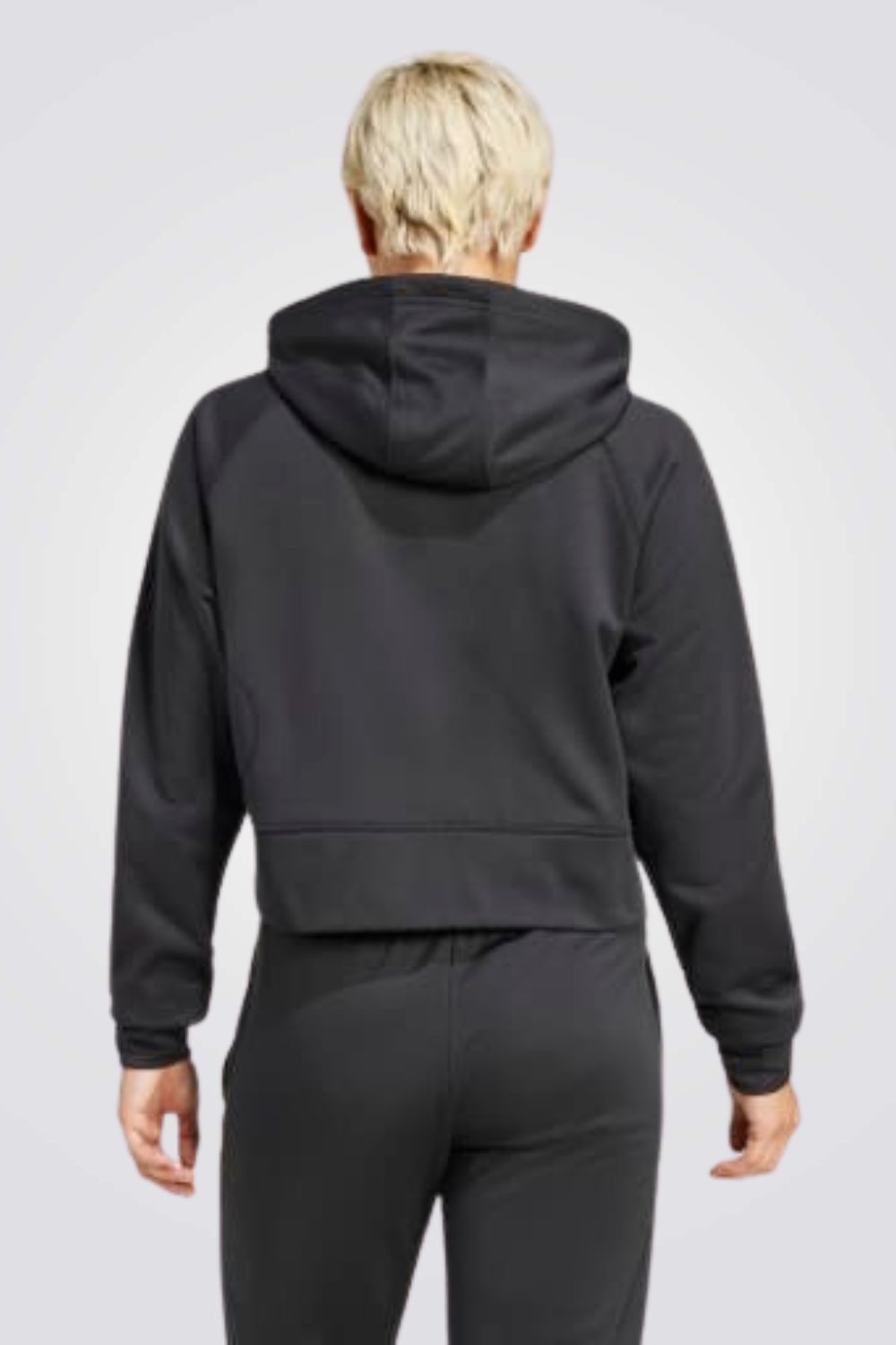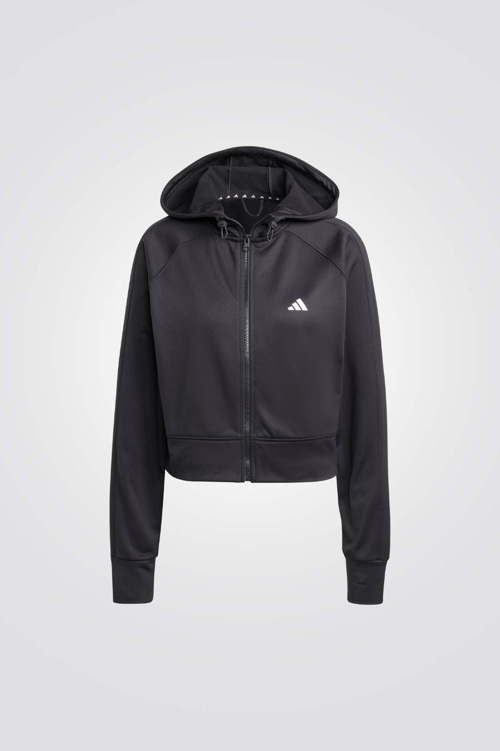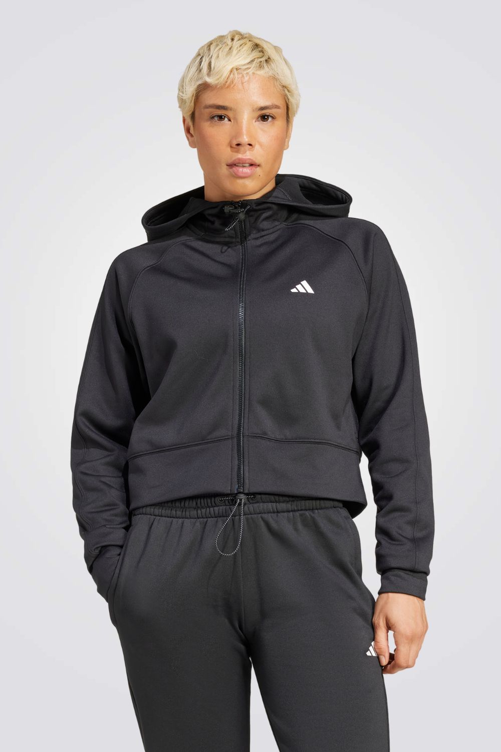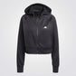 ג'קט לנשים מבית המותג ADIDAS בצבע שחור בגזרת קרופ עם כובע קפוצ'ון, צווארון גבוה וסגירת רוכסן.