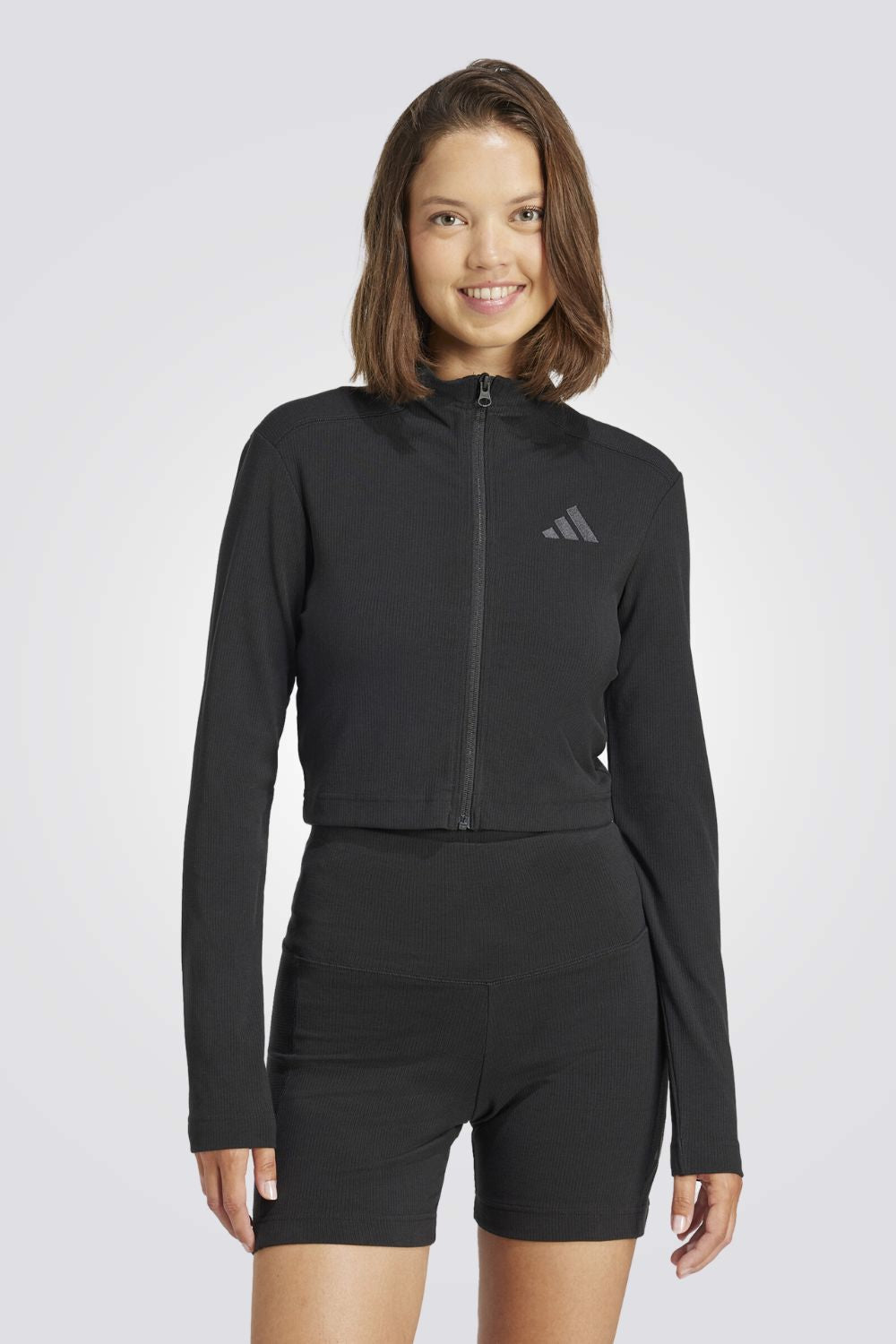 ג'קט אימונים דק מבית המותג ADIDAS לנשים בצבע שחור, בעלת שרוולים ארוכים דקים, ריצרץ לסגירה, עשוי מבד רך ונמתח וסמל המותג בשחור רקום בקידמת הג'קט.