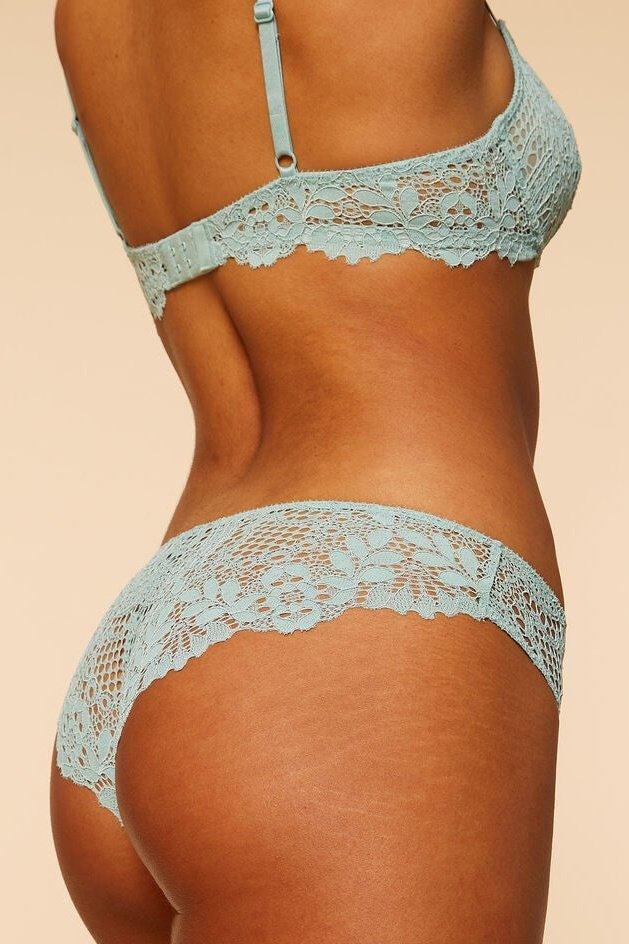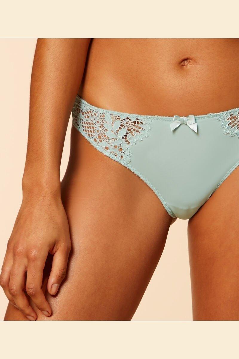 תחתונים בגזרת היפסטר מבית המותג ETAM בגוון טורקיז בהיר עשויים תחרה פרחונית עדינה משולבת בבד מיקרופייבר רך בחלק הקדמי ועיטור פפיון במרכז.