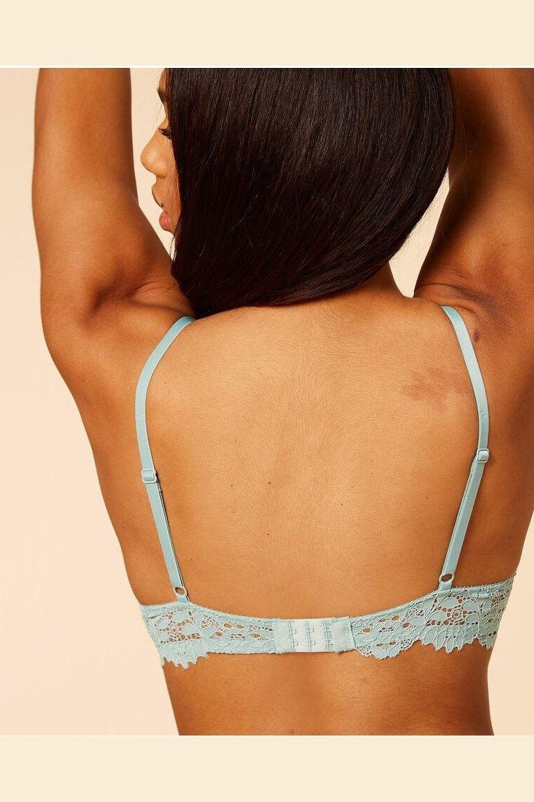 חזיית תחרה בגוון טורקיז בהיר מבית המותג ETAM עם קאפים מרופדים המעניקים מראה מעוצב ואפקט פוש אפ עד מידה אחת יותר, כתפיות מתכווננות וסגירת קרסים אחורית.